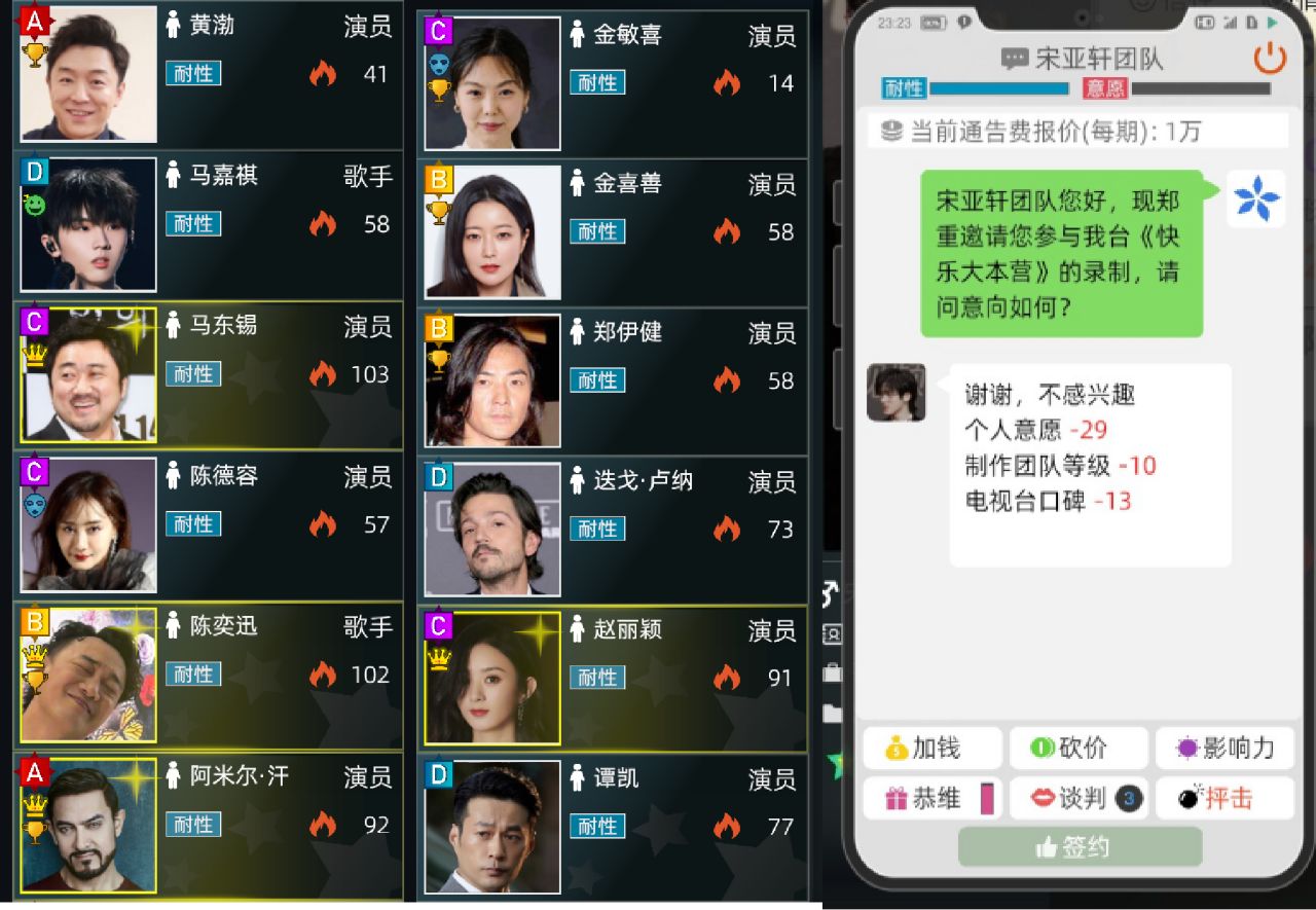 遊戲開局,沒有資金、沒有熱播劇、沒有演播室、沒有影視綜藝IP,要想賺錢還是得幹外包。招募一批優質賽博牛馬,然後讓他們出去跑業務賺取第一桶金。