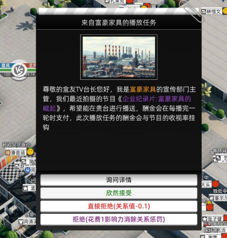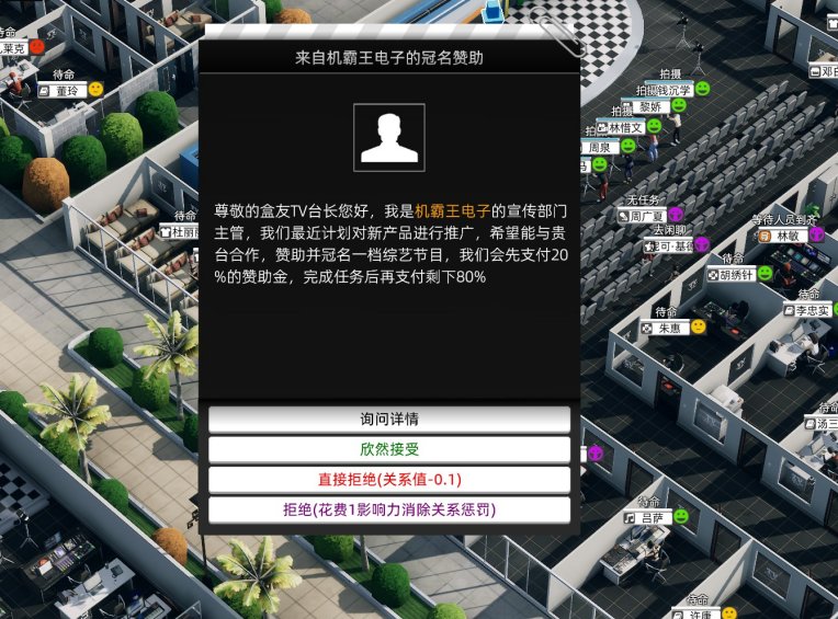 製作節目沒有起始資金怎麼辦?遊戲會天降金主,來自機霸王電子(致敬小霸王學習機?)的冠名贊助。遊戲初期的贊助,不要求收視率回報,但會要求節目環節設定(例如遊戲產品會要求有電子競技的訪談,食物會要求有美食知識)。