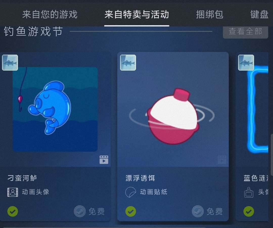 除了釣魚遊戲折扣外,每逢活動steam都會推出喜加三的福利。這次也不例外,免費釣魚頭像、貼紙、邊框別忘了領取哦。