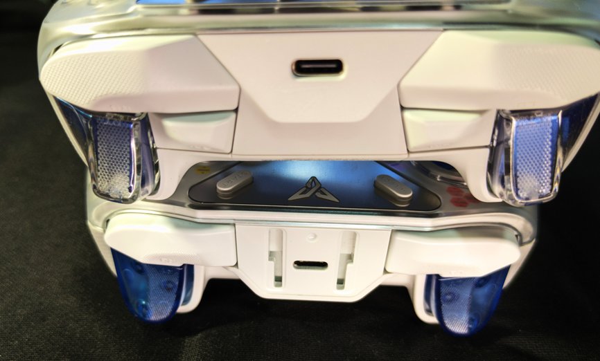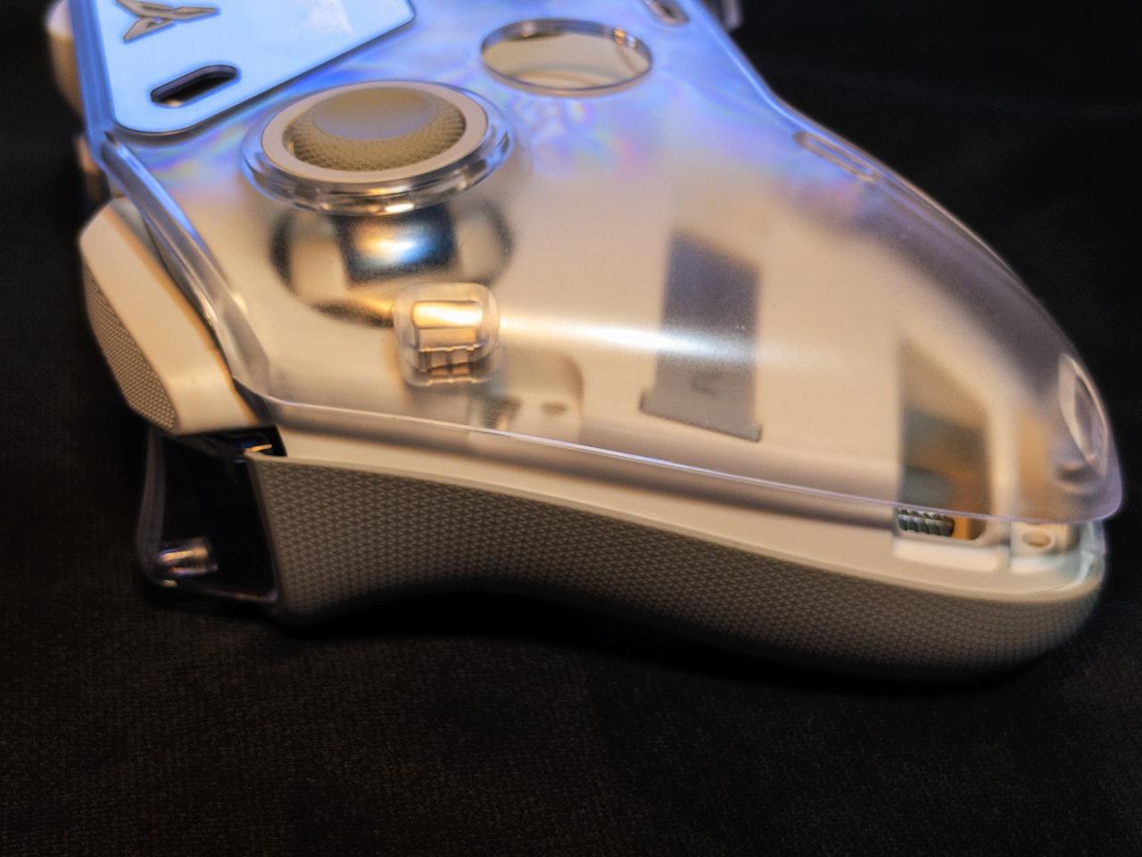 背部这次改变挺好的,之前中间两个小背键按压其实挺难受我很少会去用,现在去除了两侧改成加大加宽的大背键,中指自然搭上去就能摁到,以及两个可拆的拨片式按键,我是习惯4指握姿,刚好是无名指放的位置,不过这样就会有悬空感,可直接拆掉握起来更充实