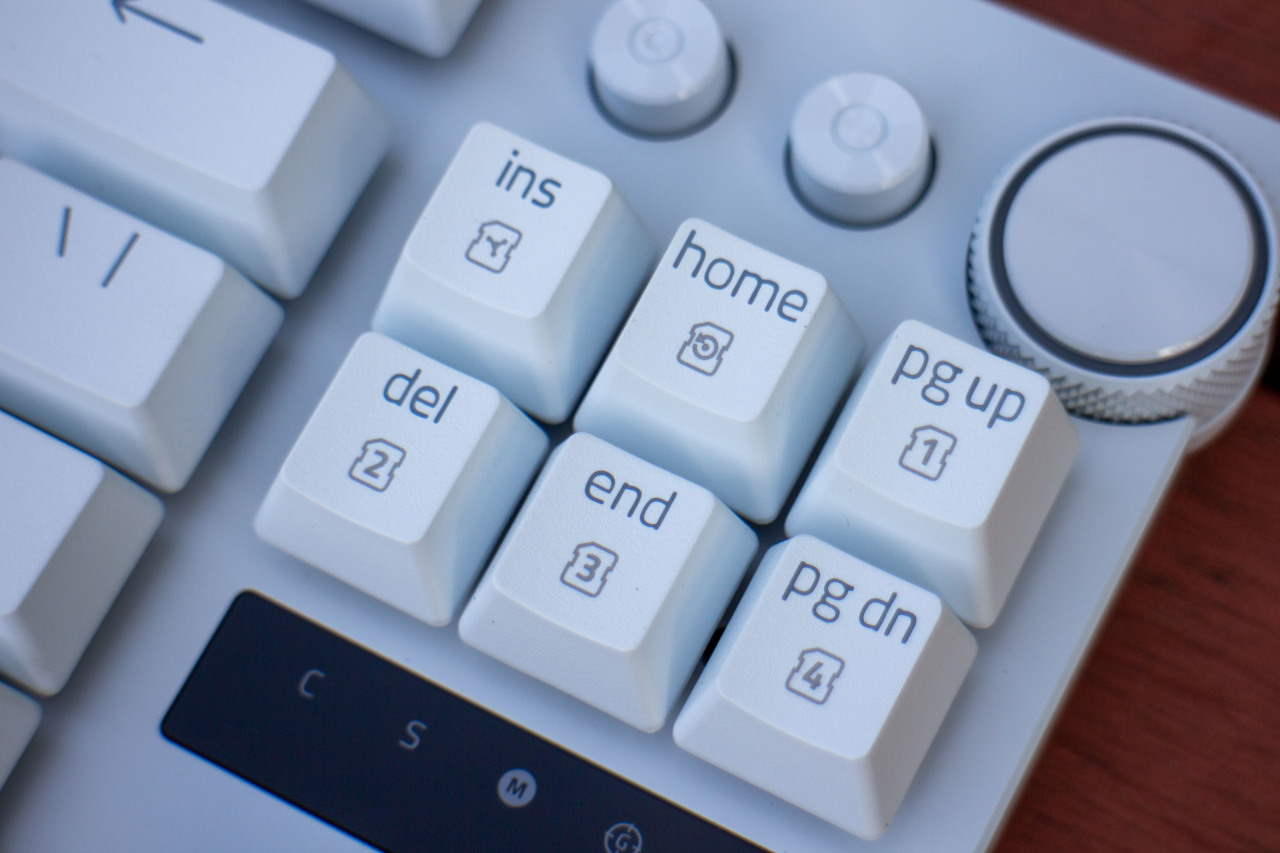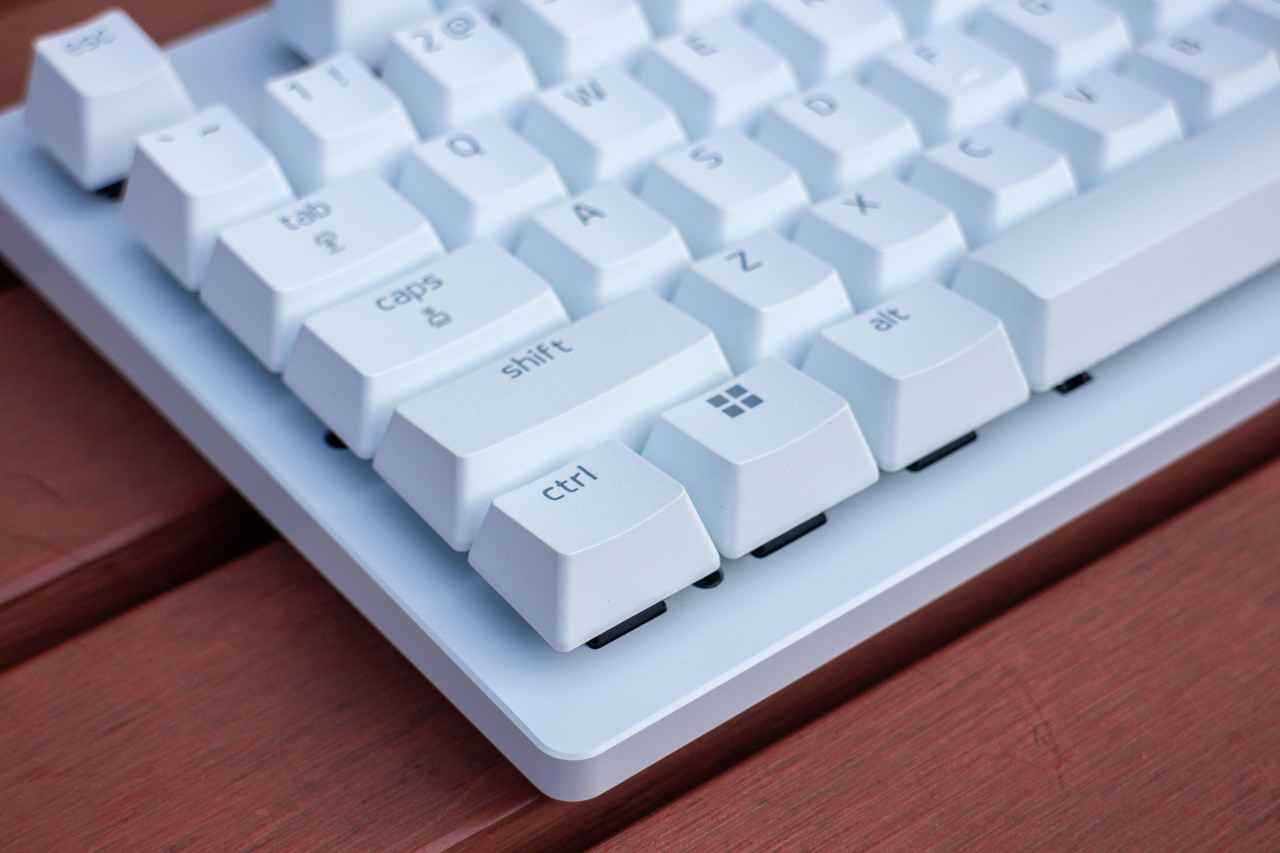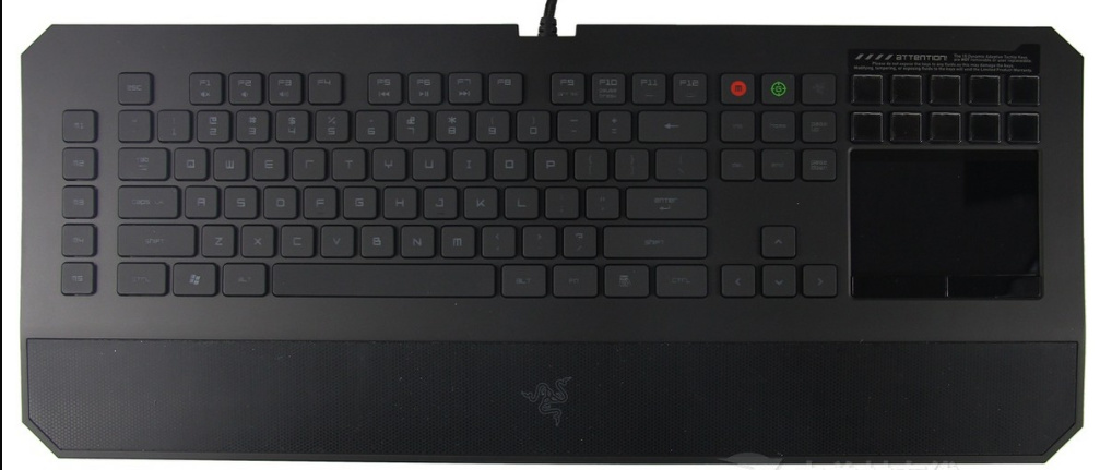 鍵帽採用的是PBT雙色注塑材質,對於雷蛇的鍵盤本人反倒更期望上ABS鍵帽,透光度要更好一些。但是實際表現確很令人滿意,尤其是室內光源較弱的情況下,鍵帽透光均勻很高。