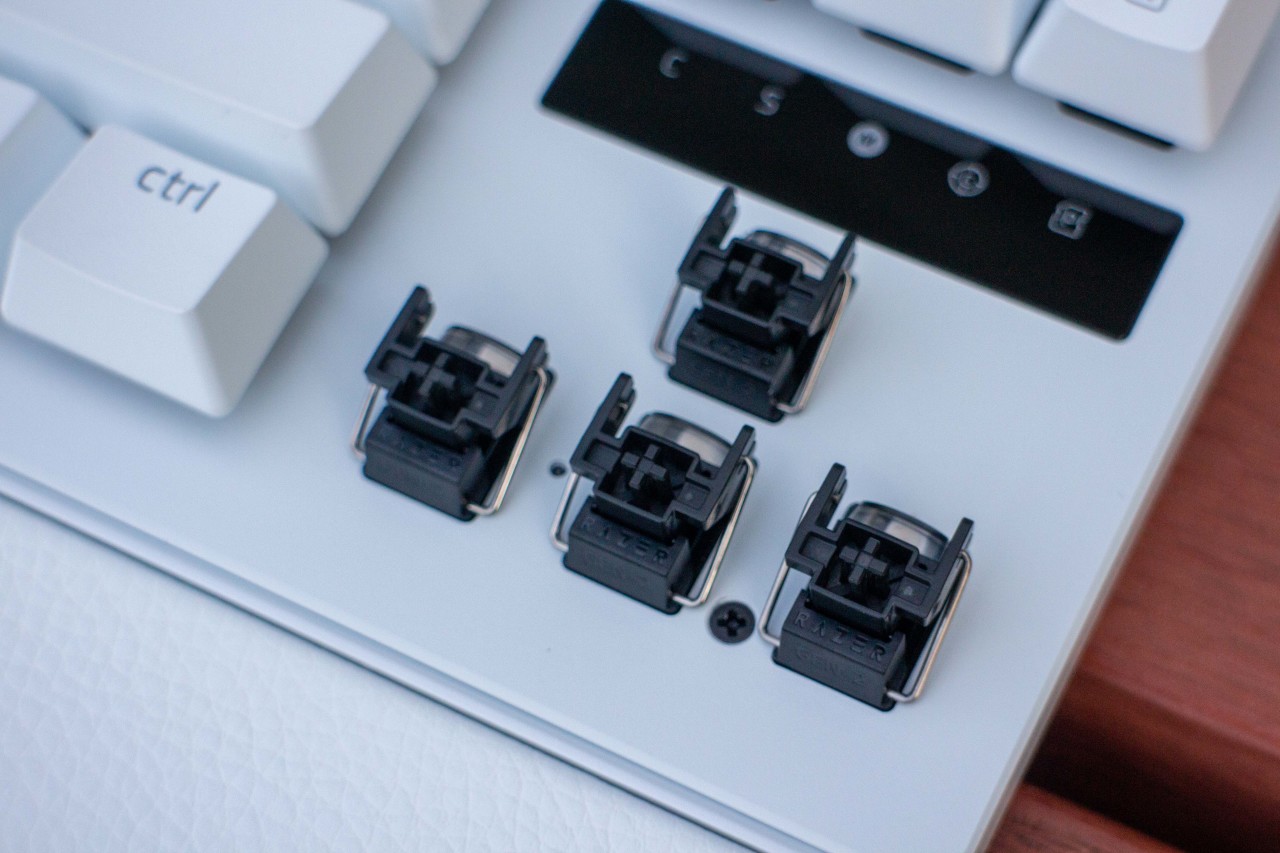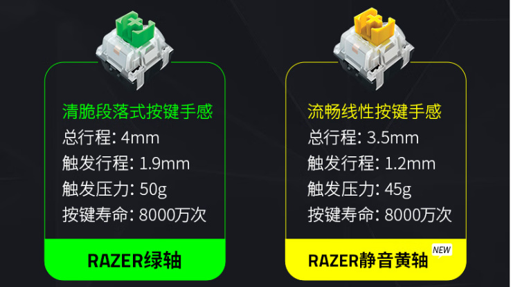 軸體沿用V2上的雷蛇第二代RT光軸,主要升級點在於RT範圍大幅提高,從初代的1.5—3.6mm提升至0.1—4.0mm,鍵程也額外增加0.3mm,更有利好高敏用戶。