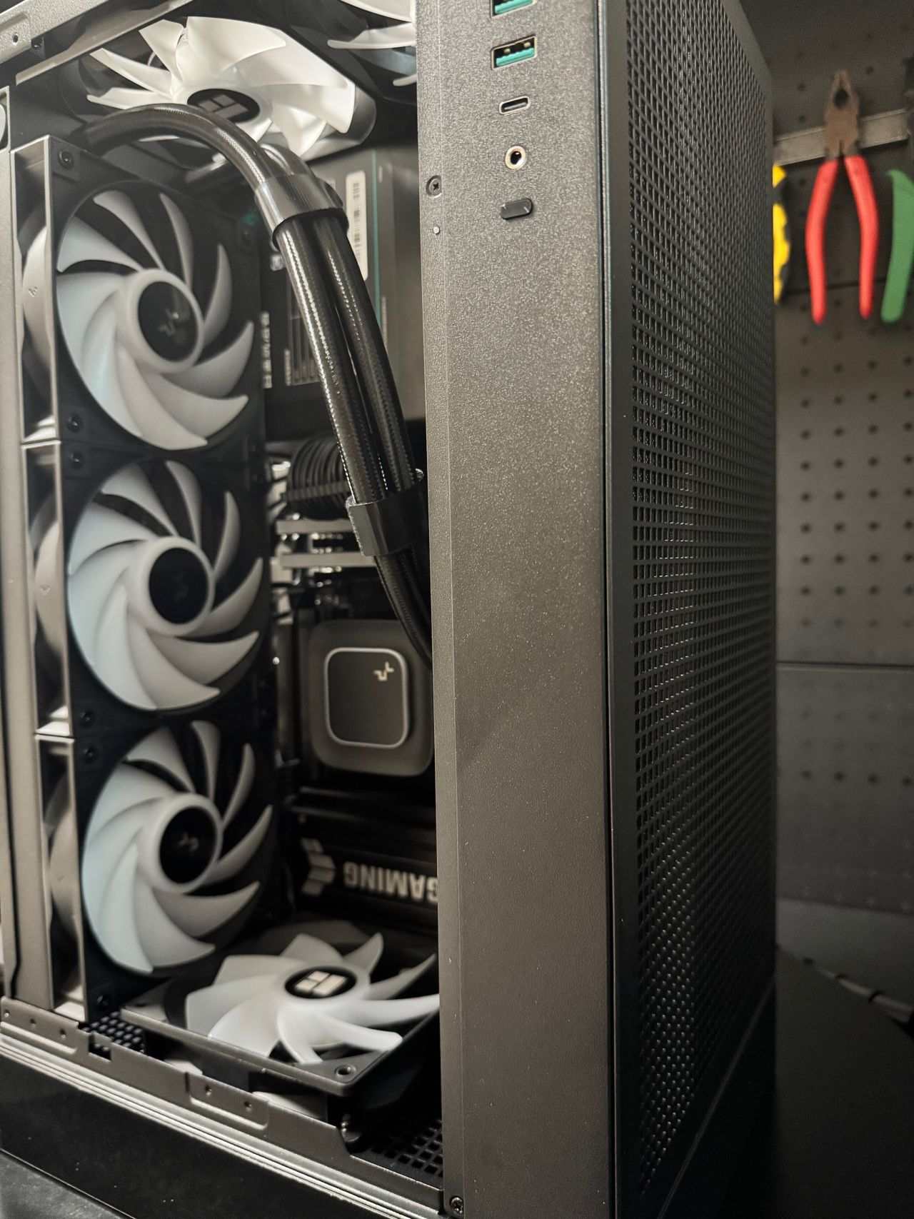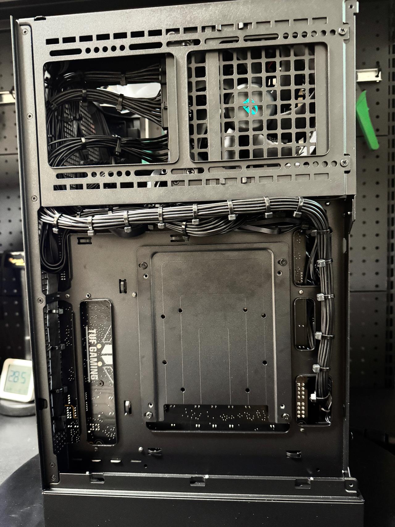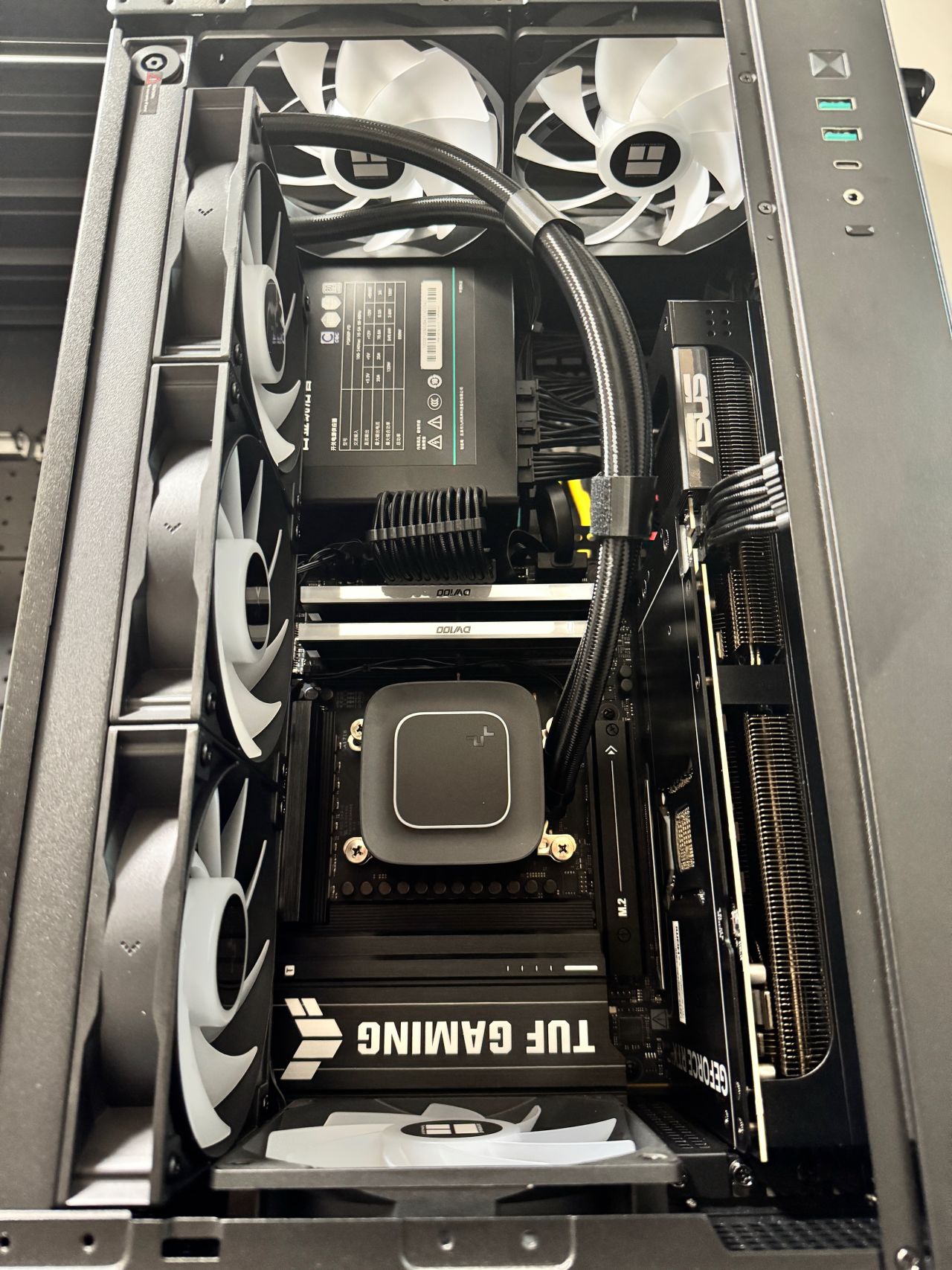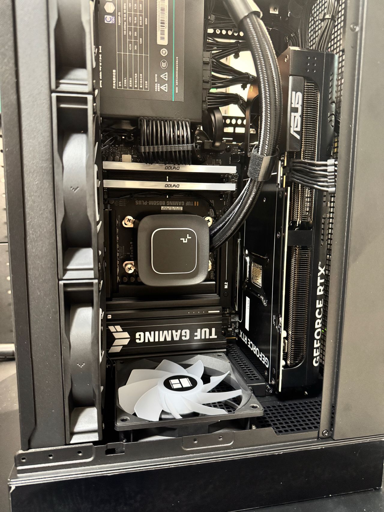 盒友使用的是5070TI顯卡,顯卡供電線,可以走顯卡風扇面,不會與風扇打架,不建議5080以上顯卡,顯卡太厚,供電線無法走顯卡風扇面。