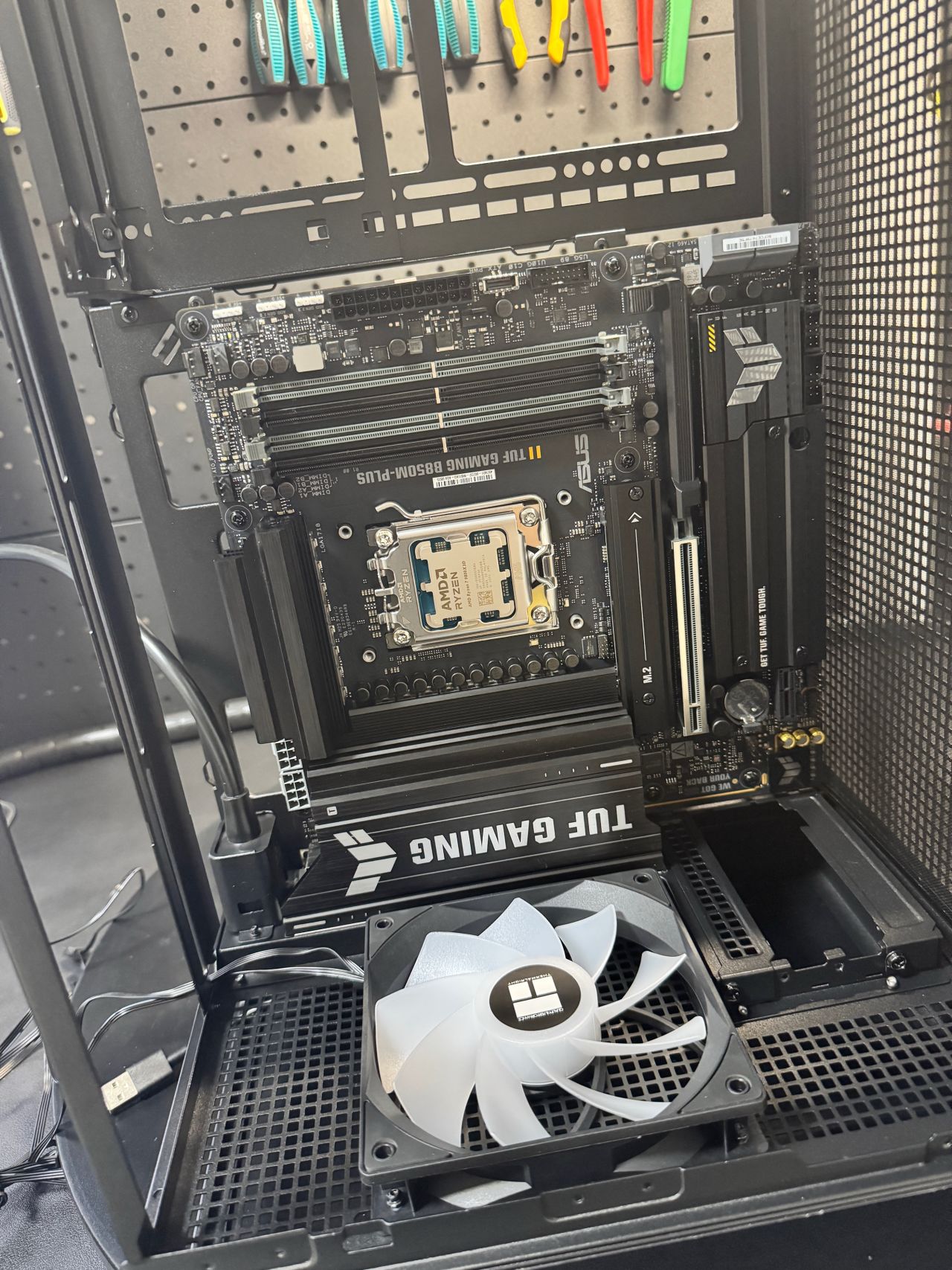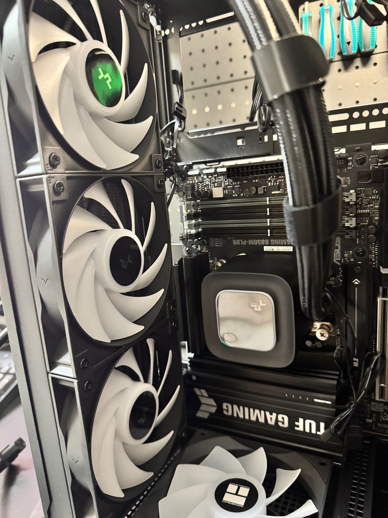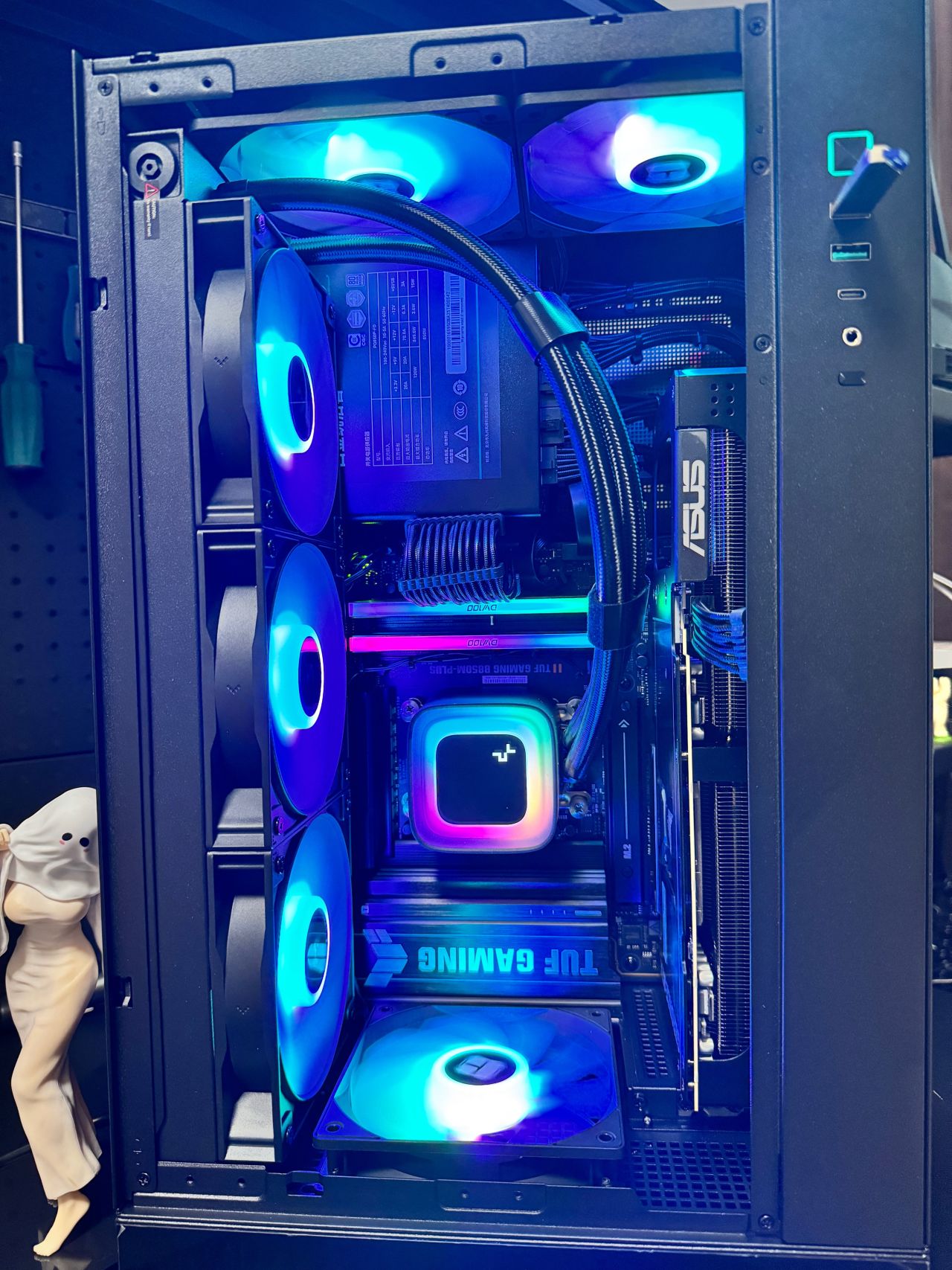 盒友使用的是5070TI顯卡,顯卡供電線,可以走顯卡風扇面,不會與風扇打架,不建議5080以上顯卡,顯卡太厚,供電線無法走顯卡風扇面。