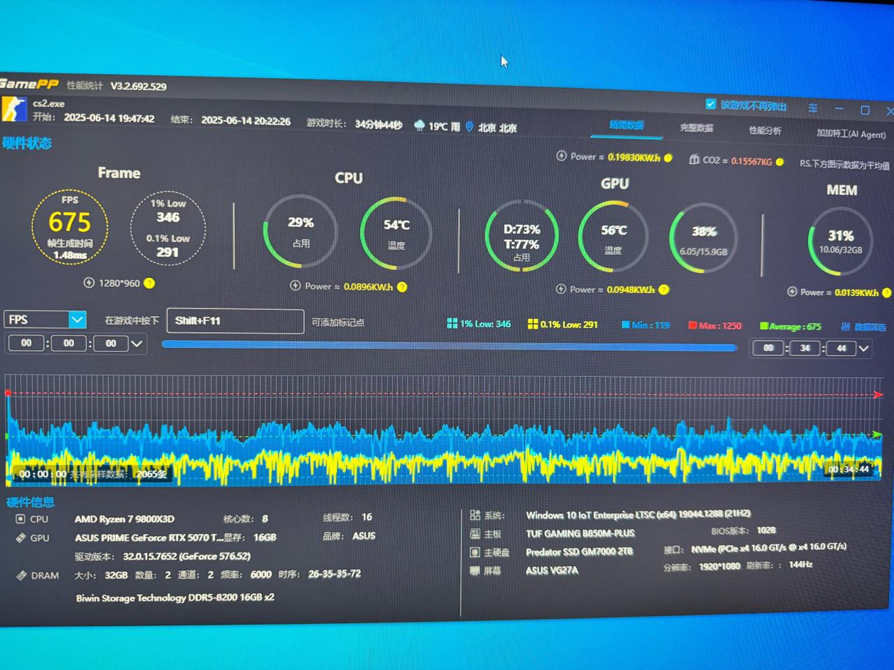 遊戲加加完整對局測試,這是在室溫27.5攝氏度情況下測試,正常數值,溫度表現良好。