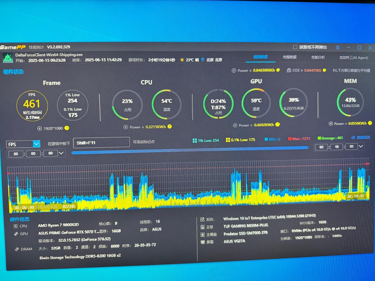 2小時19分鐘的摸金測試,平均461,1%low 254,溫度54°,各數值均表現優秀。