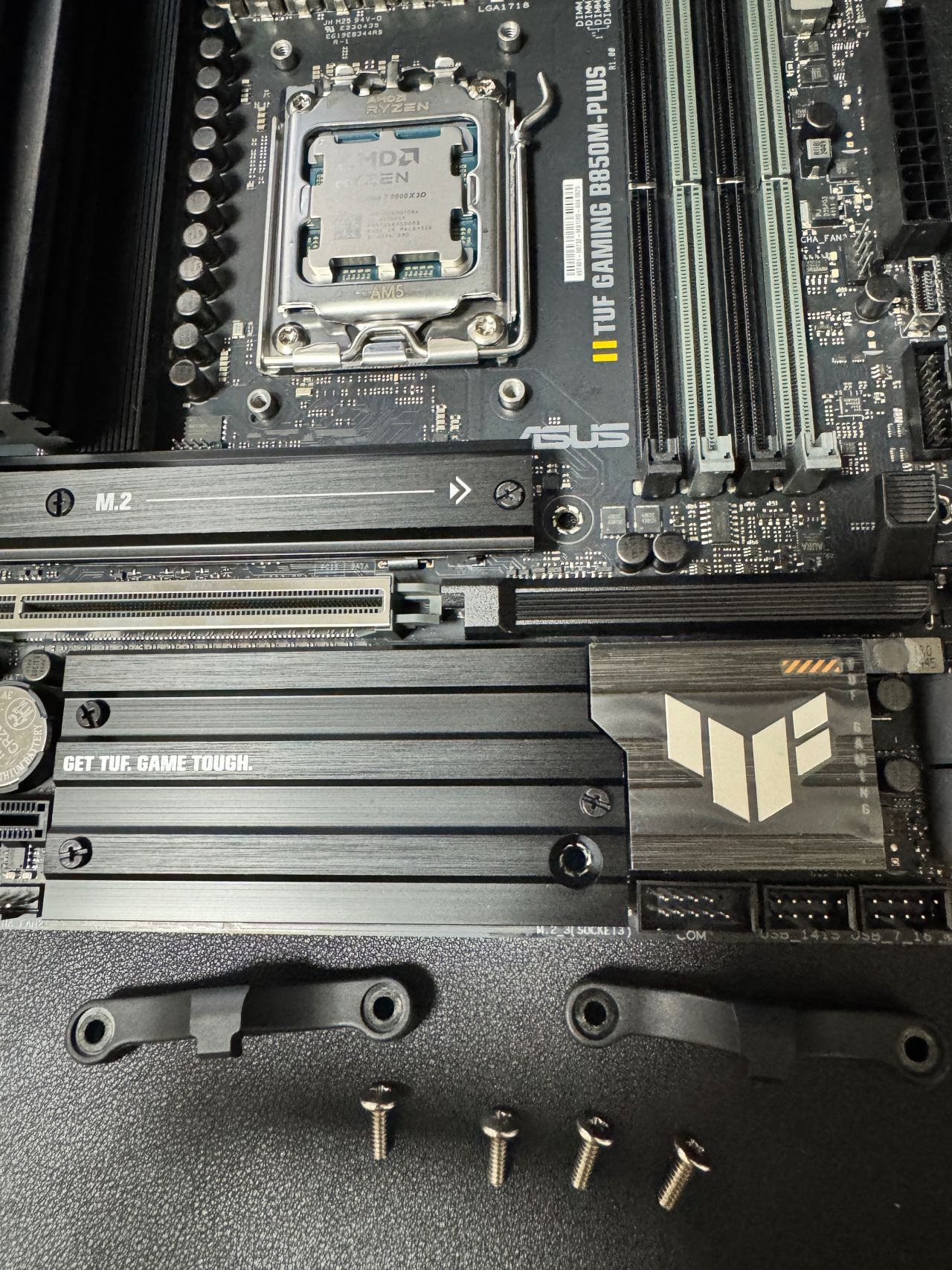 注意第二排中間的固定孔位,也就是第一條固態馬甲右邊的孔位,ASUS白色logo下方這個孔位,一定要扣住底部的銅柱,纔算是整個主板與銅柱全部貼合,最後擰上8顆固定螺絲即可。