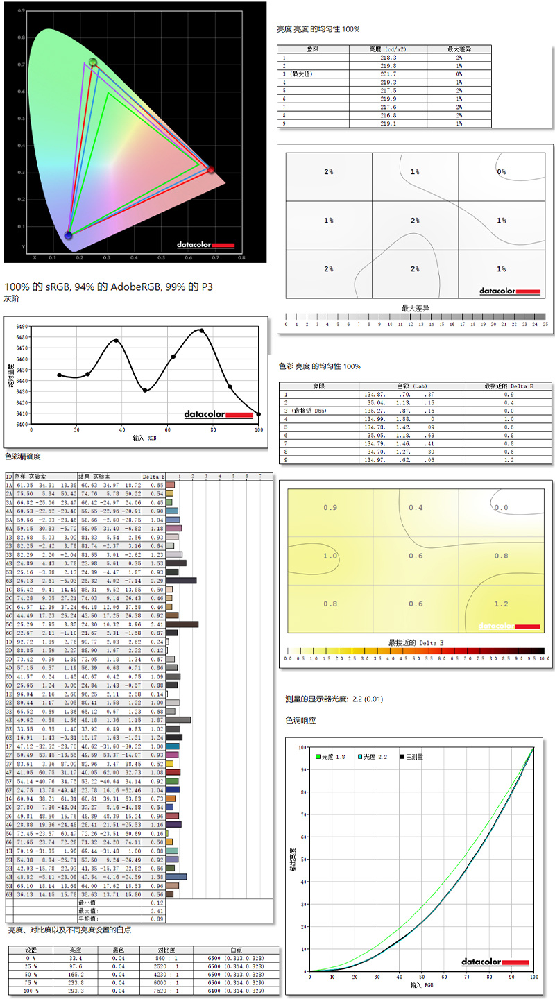 默认显示模式下,测试结果如上,微星272QP X50色域覆盖100%sRGB、94%AdobeRGB、99%P3,光度曲面完美贴合标准光度,灰阶绝对色温6410K-6490K之间,100%亮度可达293nit,对比度达到7520:1,白点色温在6400k-6500K之间,总体非常贴近6400K标准色温,色彩均一性上,9区最大ΔE为1.2,亮度均一性上,9区最大偏差2%,色彩精准度上,平均ΔE为0.89,总体表现堪称完美。