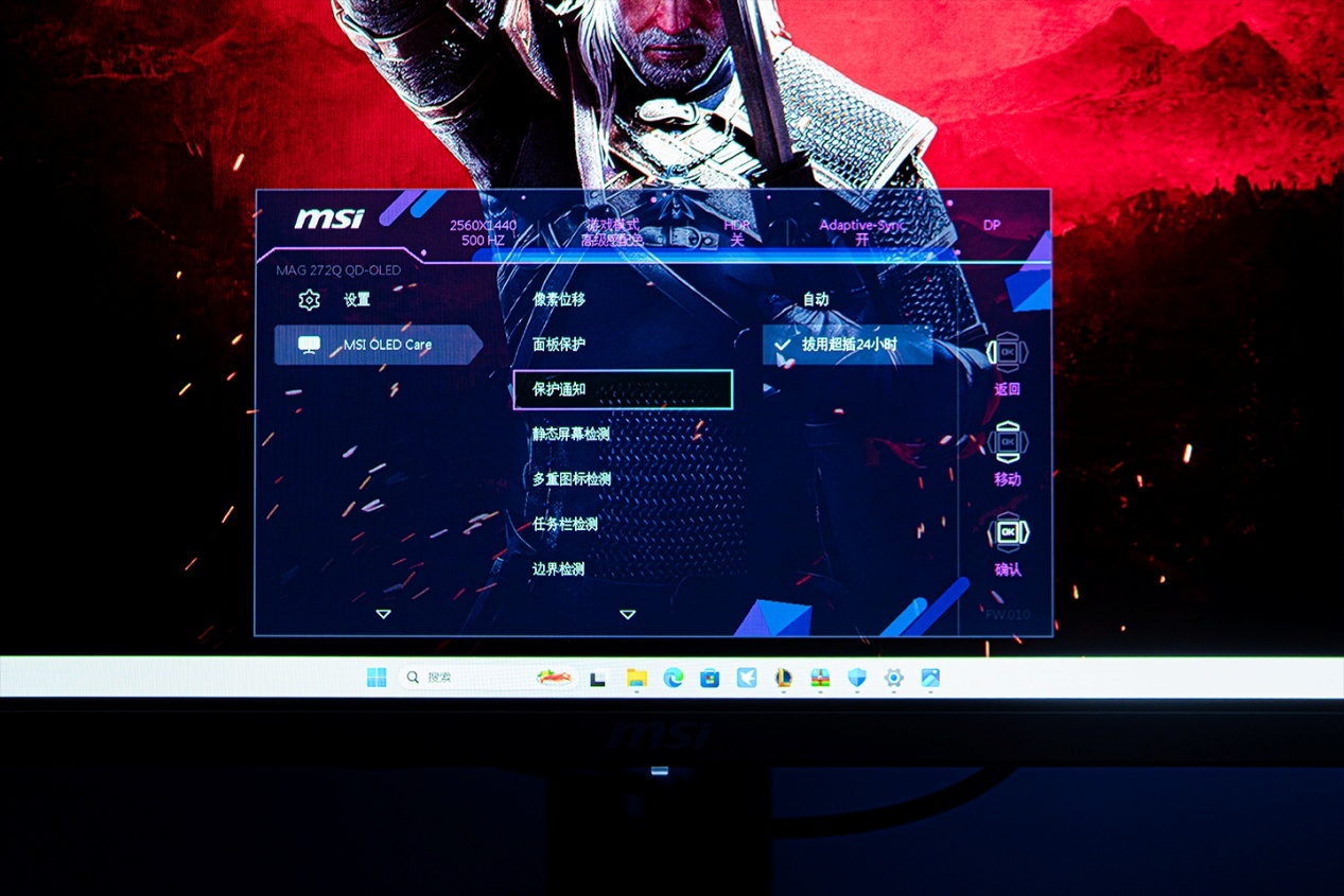 选择OLED产品,大部分人都会担心寿命问题,实际上经过这么多年的发展,OLED屏幕保护技术已经相当到位了,微星272QP X50屏幕就上下左右就预留额外像素供像素位移使用, 内置程序还有【静态屏幕检测】、【多重图标检测】、【任务栏检测】、【边界检测】等。关于【保护通知】,老款显示器很多用户反馈玩游戏时经常会弹出提示窗,非常影响体验,微星272QP X50已支持【拔用超插24小时】,也就是连续使用超24h才有提示,正常使用已经看不到弹窗了,休眠时自动运行面板保护用户完全无感。