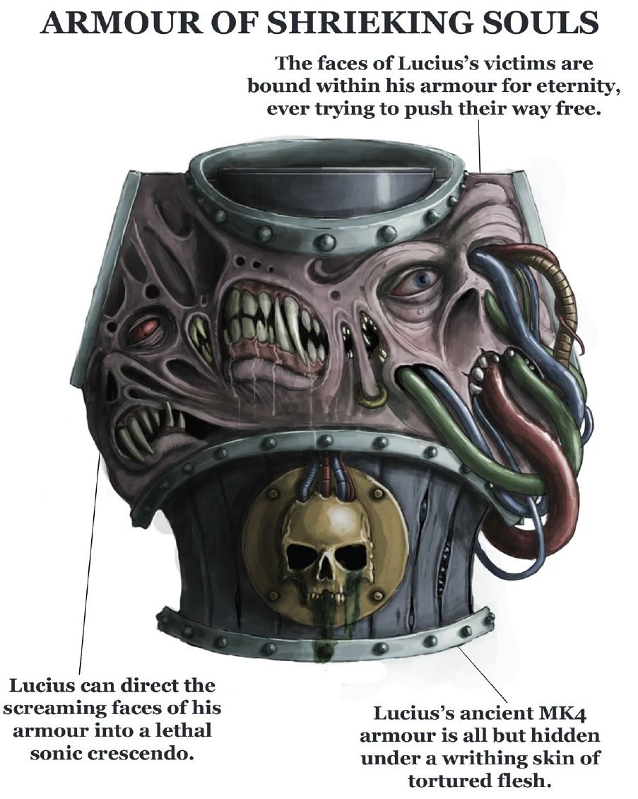 自那日起,卢修斯便背负着黑暗王子赐予的诡异祝福:任何杀死这位混沌冠军之人,只要从中获得丝毫快感,就会经历痛苦的渐变。当蜕变临近完成,卢修斯将如破茧之蝶从仇敌的躯壳中重生。而被害者,将化作永远尖啸的面容,囚禁在他那被称为"啸魂之铠"(Armour of Shrieking Souls)的肉质镶板里。