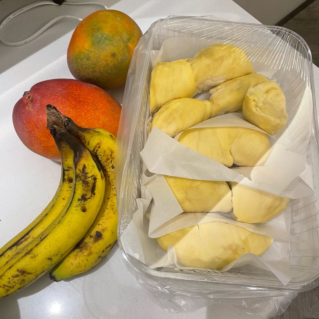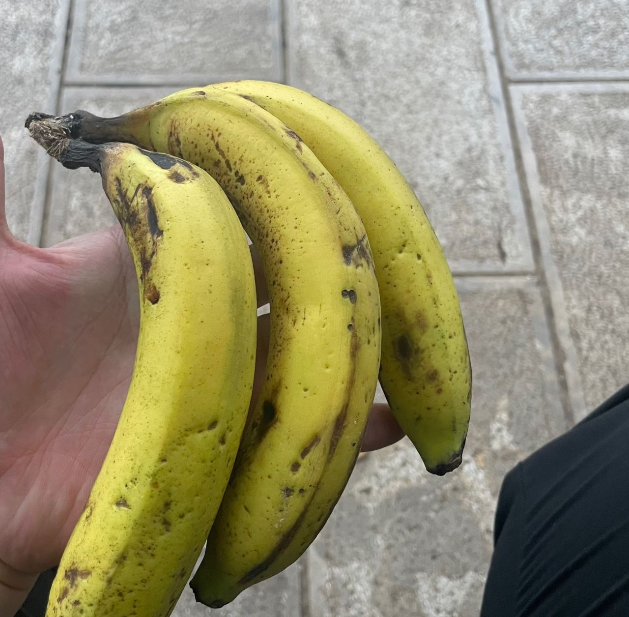 叔在给我开榴莲的时候我就继续逛了逛,看到一排绿油油的香蕉,但是都有点黑黑的,我问阿姨这是啥,她说是本地的香蕉,说绿的都没熟,我要尝尝的话给我挑几根,然后拿了4根,我开始真的以为是烂的,但里面其实是完好的,真的很甜,大家有机会一定试试