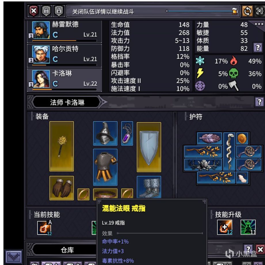 游戏中的装备系统可以说是完美符合我对暗黑游戏的幻想了,首先就是每个角色的装备栏位,主武器(单手双手)、头盔、护甲、手套、项链、两个戒指、腰带、靴子、N个护符槽位。