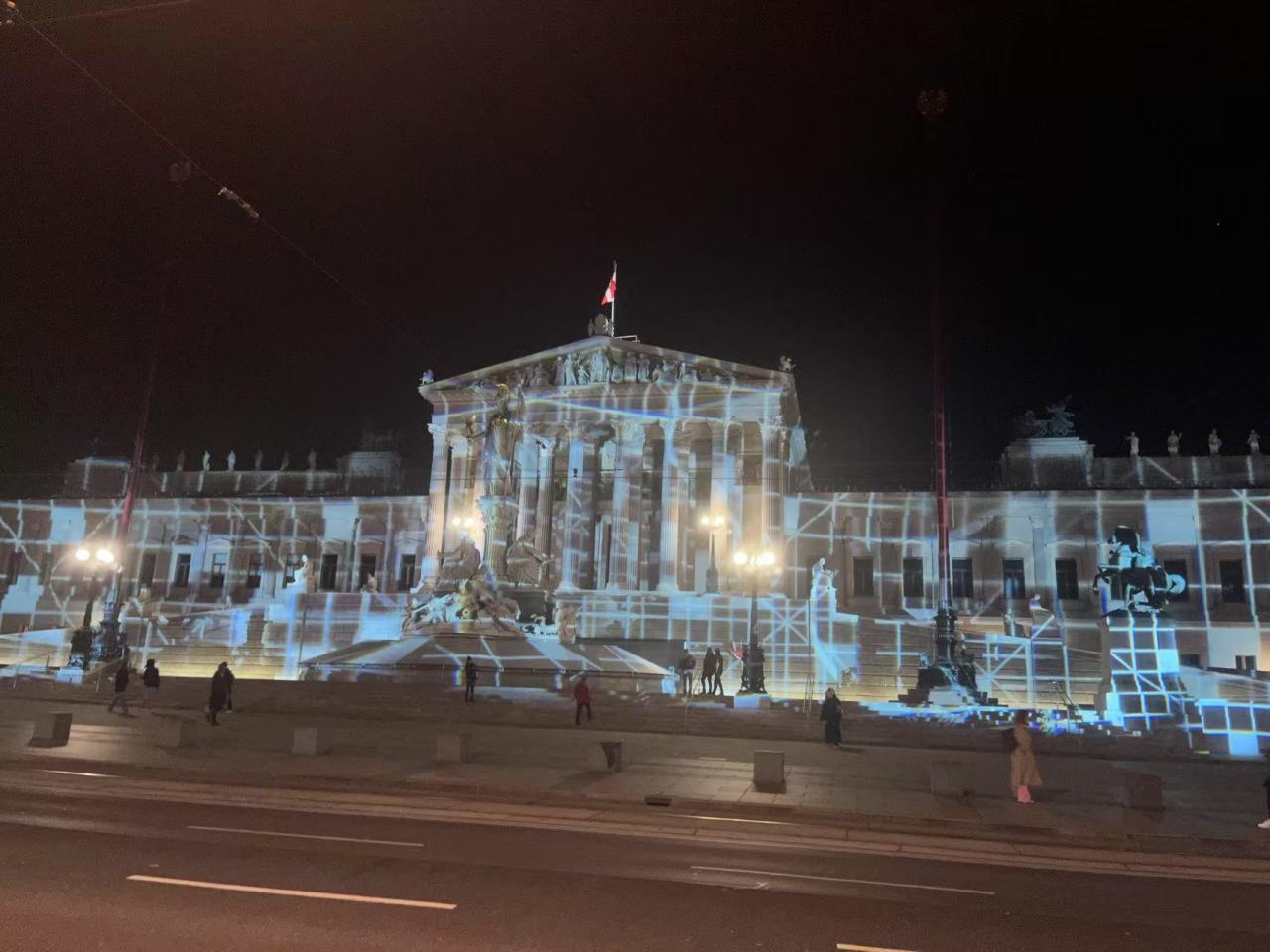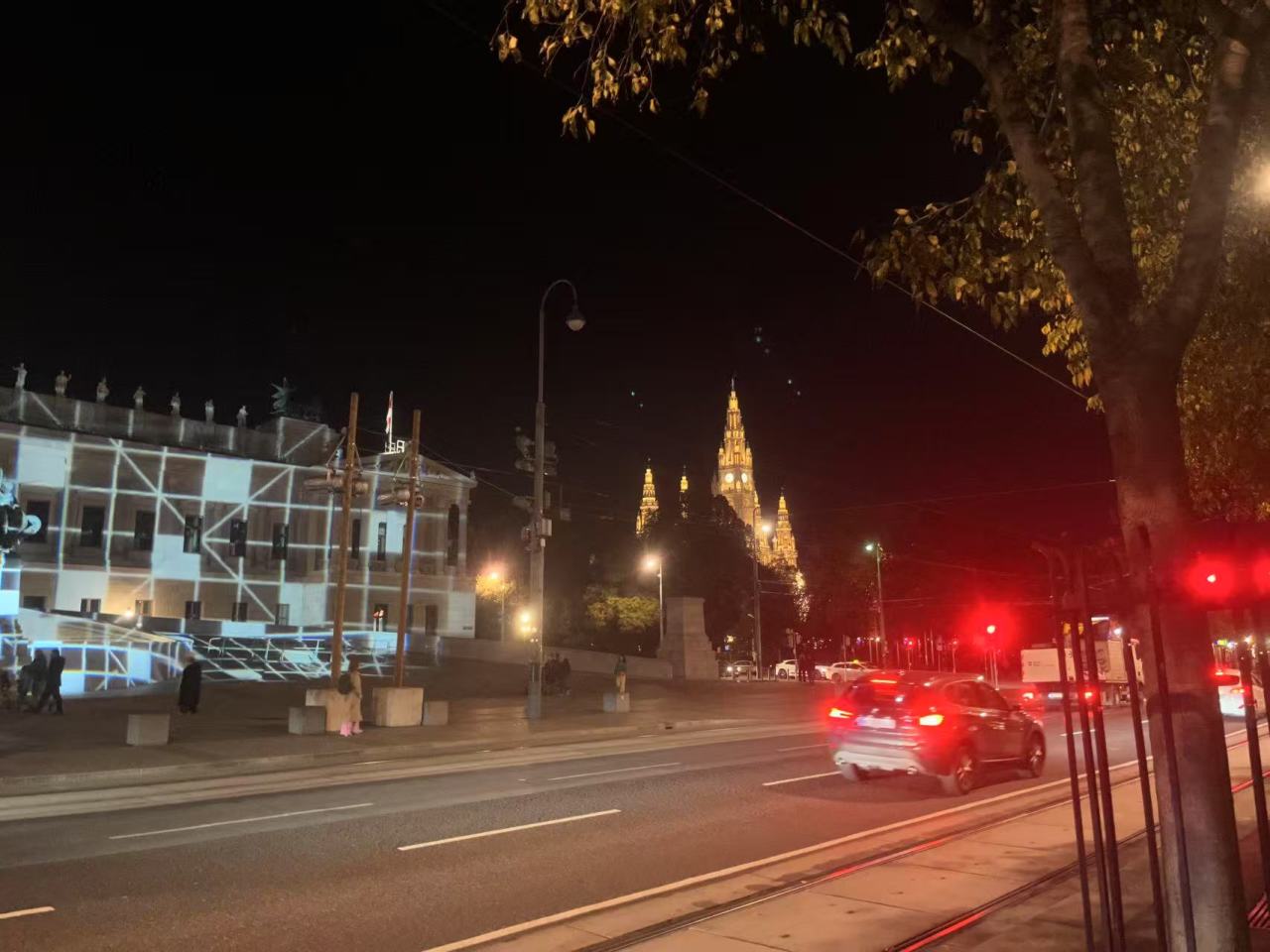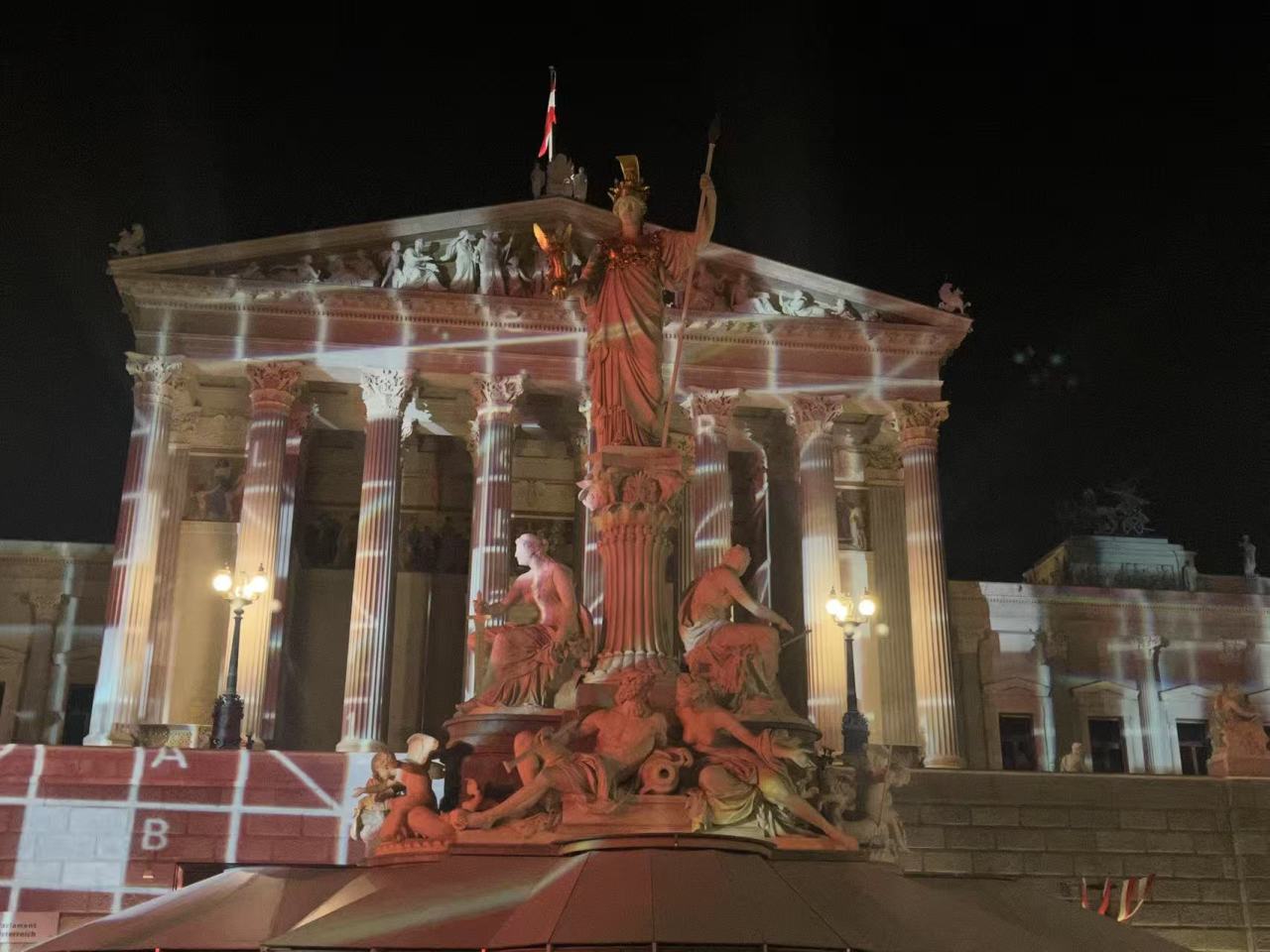 比如奥地利国会大厦,看起来它的规模并没有匈牙利的国会大厦那么大。而且到了夜晚其表面被打上了奇怪颜色的格子状光影,导致我看不清它的轮廓,只能瞧见顶部的奥地利国旗和门口驻足欣赏喷泉雕塑的年轻人。