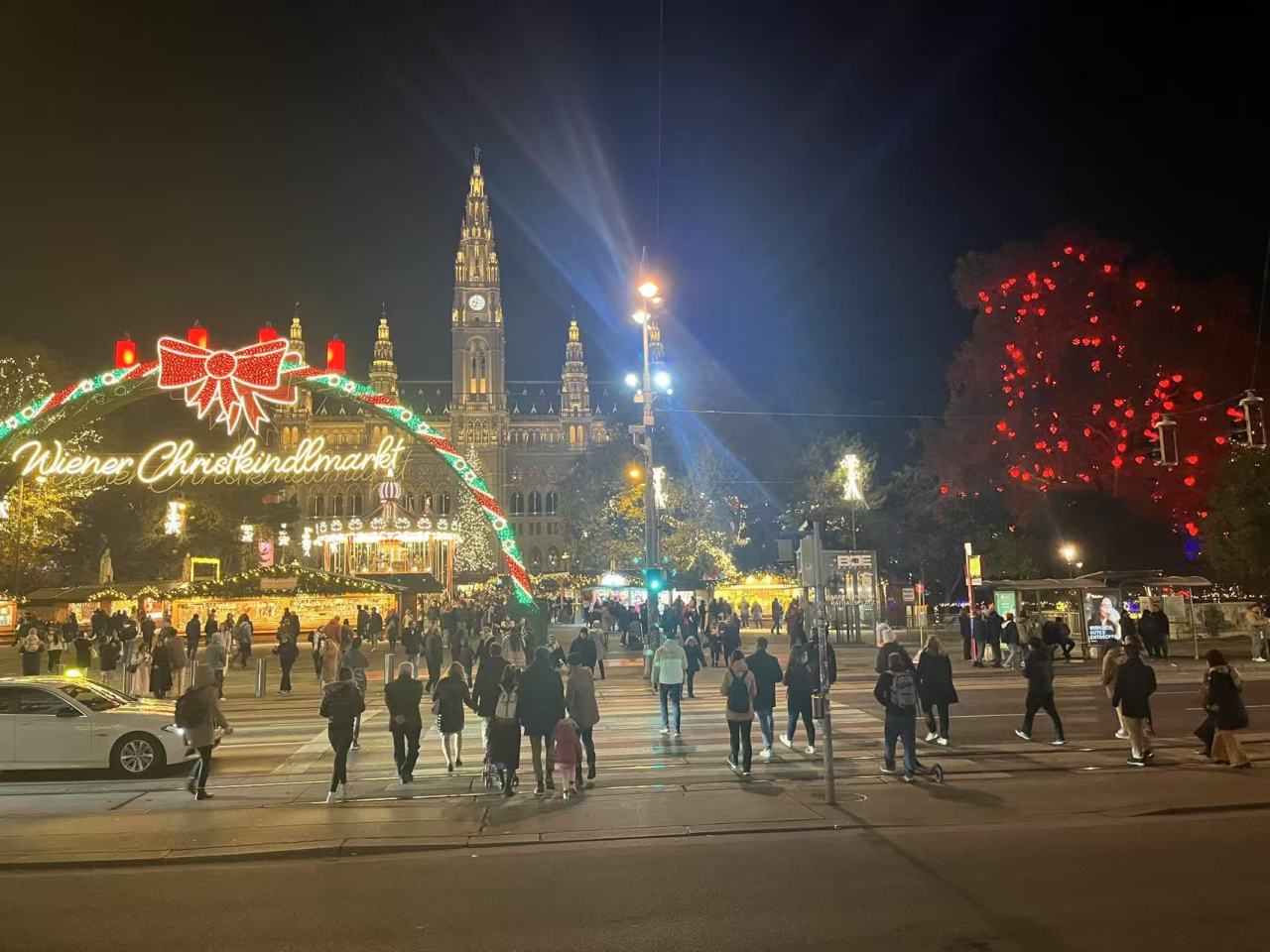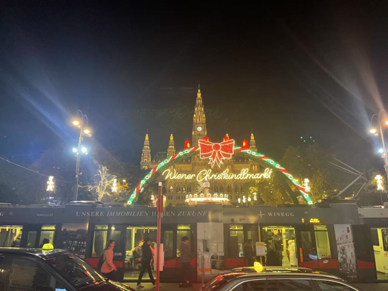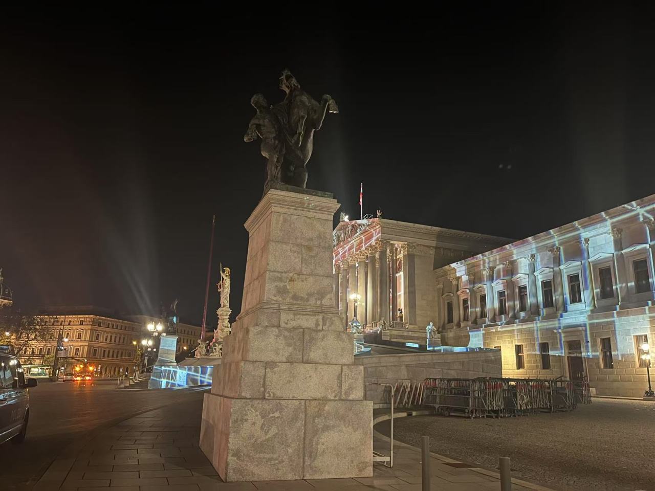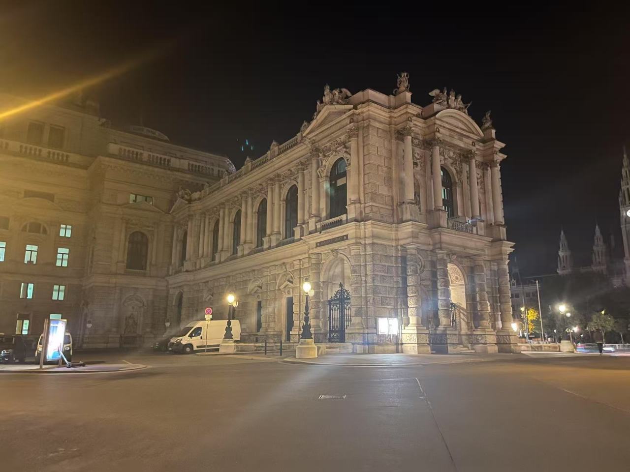比如奥地利国会大厦,看起来它的规模并没有匈牙利的国会大厦那么大。而且到了夜晚其表面被打上了奇怪颜色的格子状光影,导致我看不清它的轮廓,只能瞧见顶部的奥地利国旗和门口驻足欣赏喷泉雕塑的年轻人。