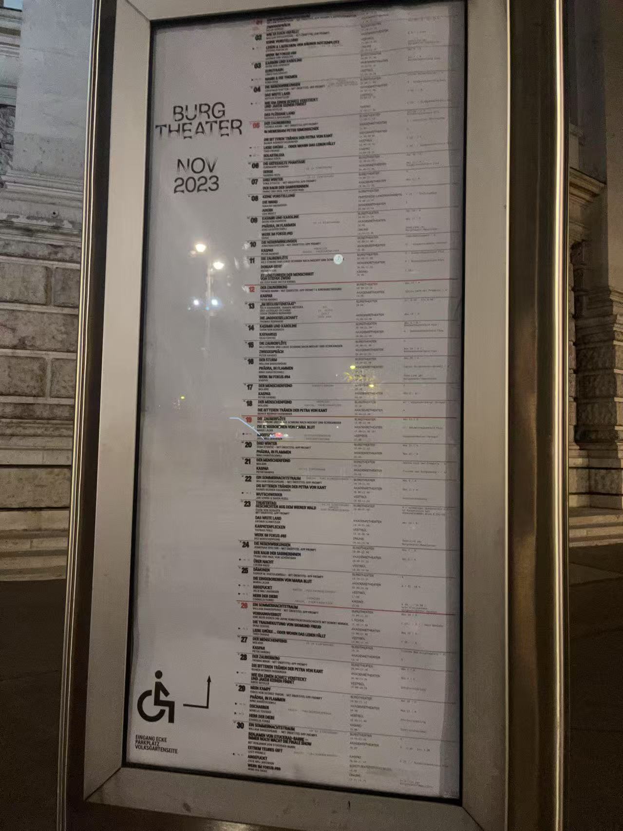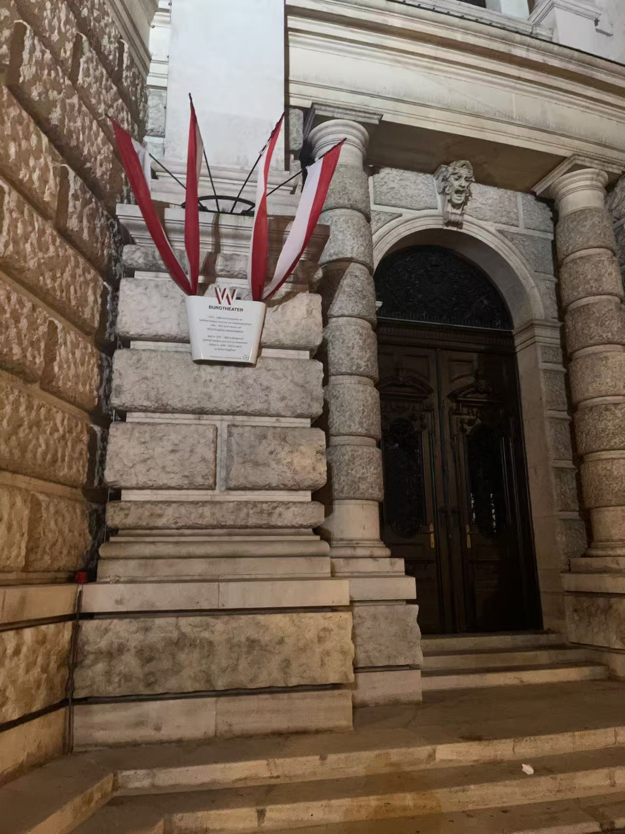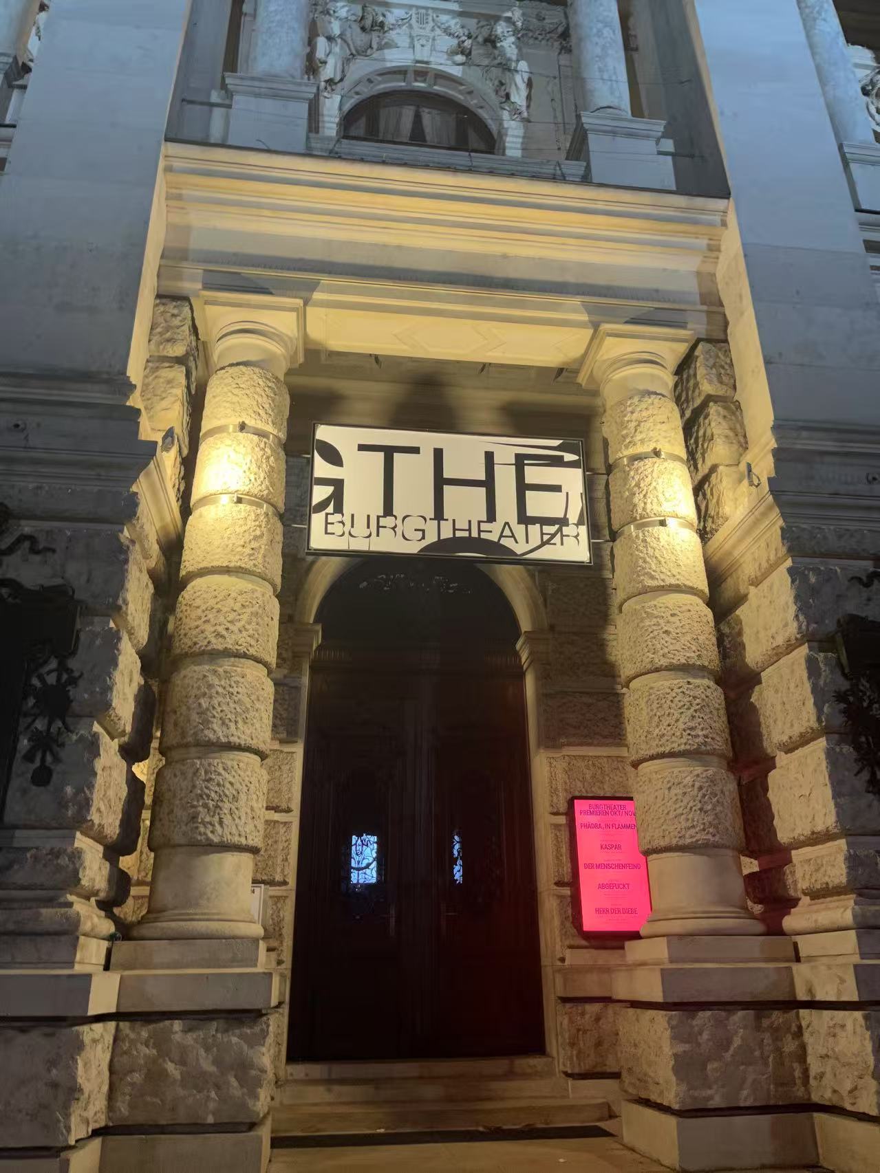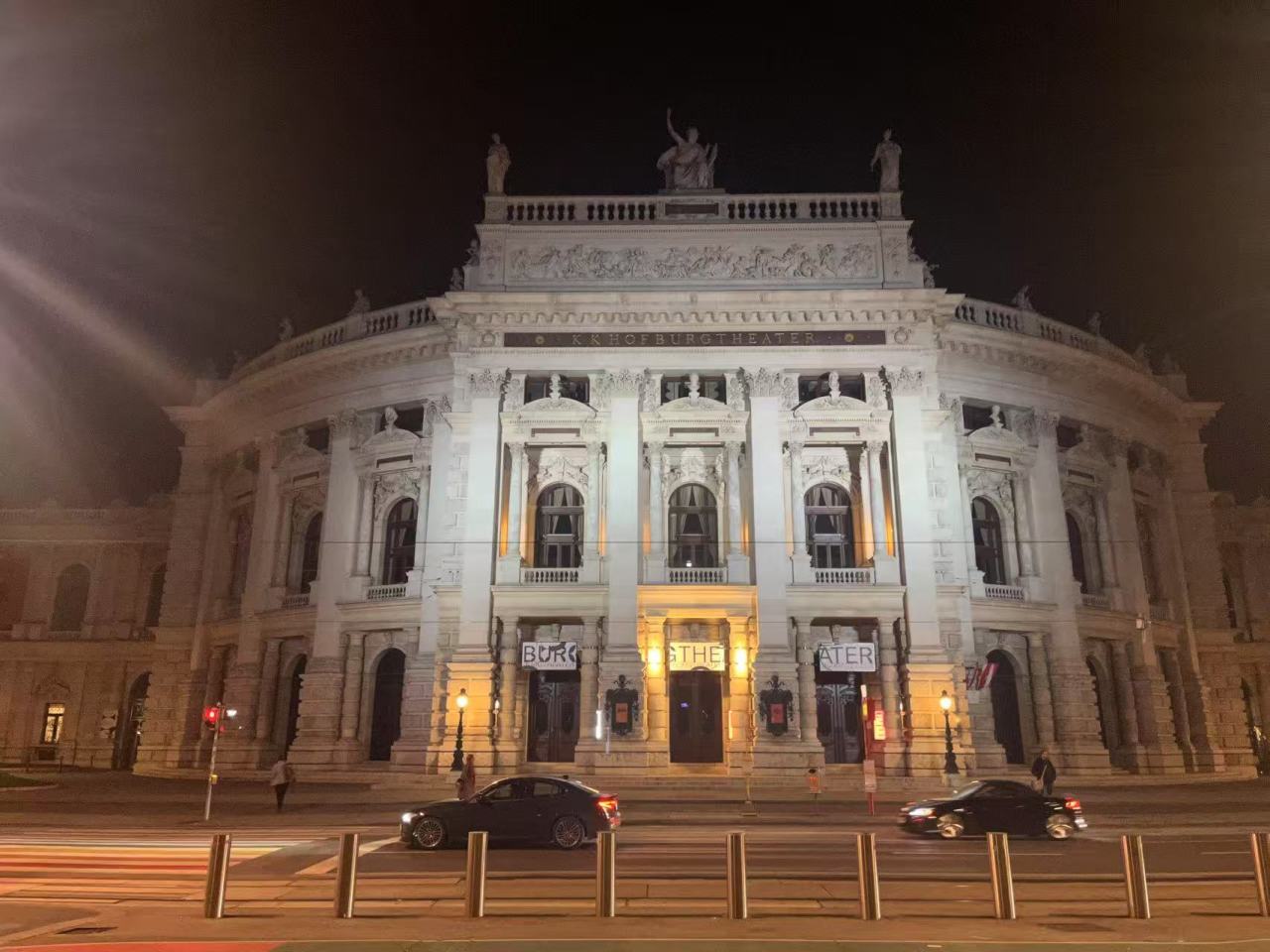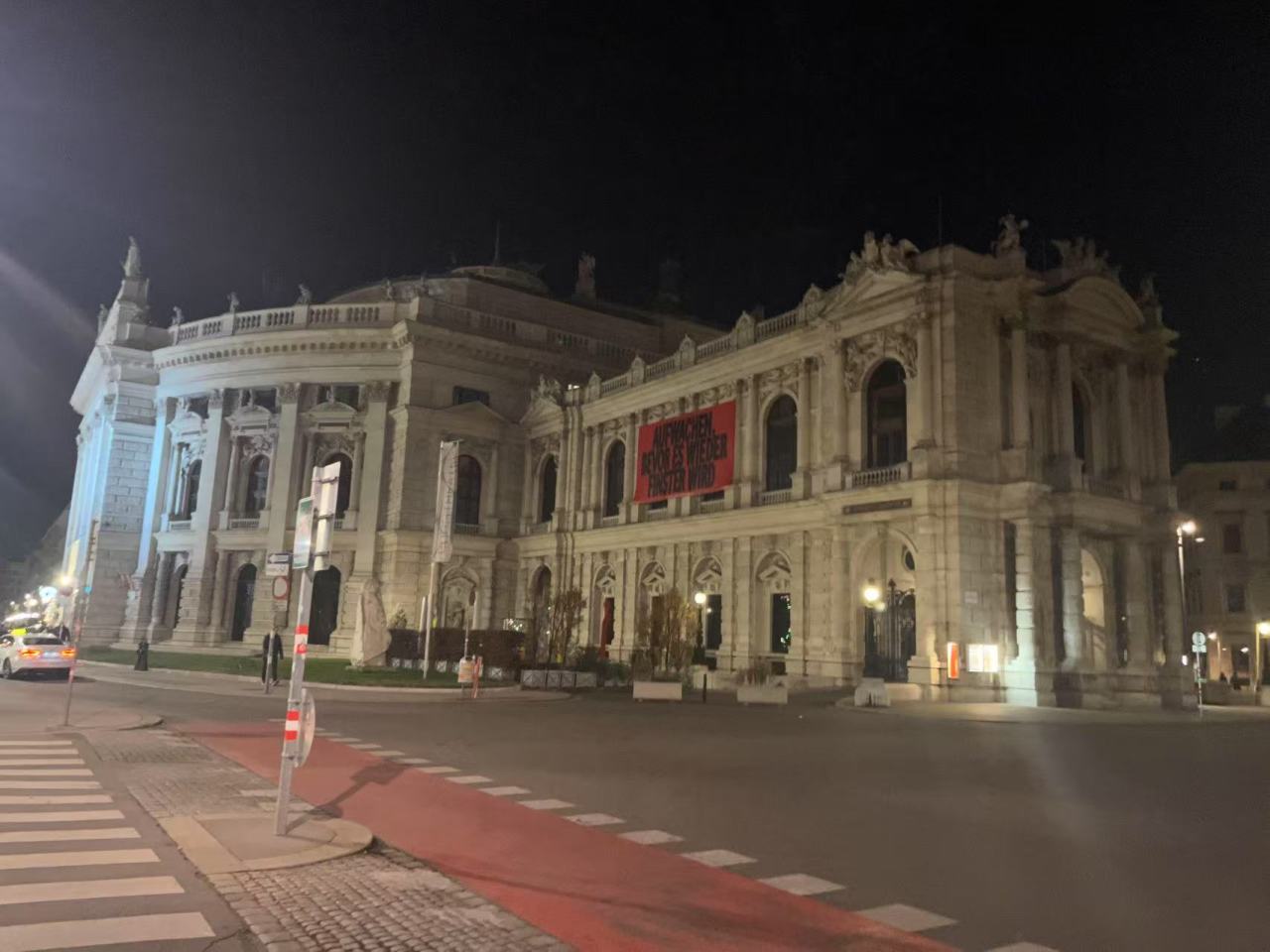再往前走数百米,把目光投向与国会大厦和市政厅遥遥相对的马路的另一头,我看到了类似帝国时代3中议会外观的建筑,这便是奥地利的国家剧院。长方体部分的二楼外围挂着德语横幅,看不懂说的是什么。