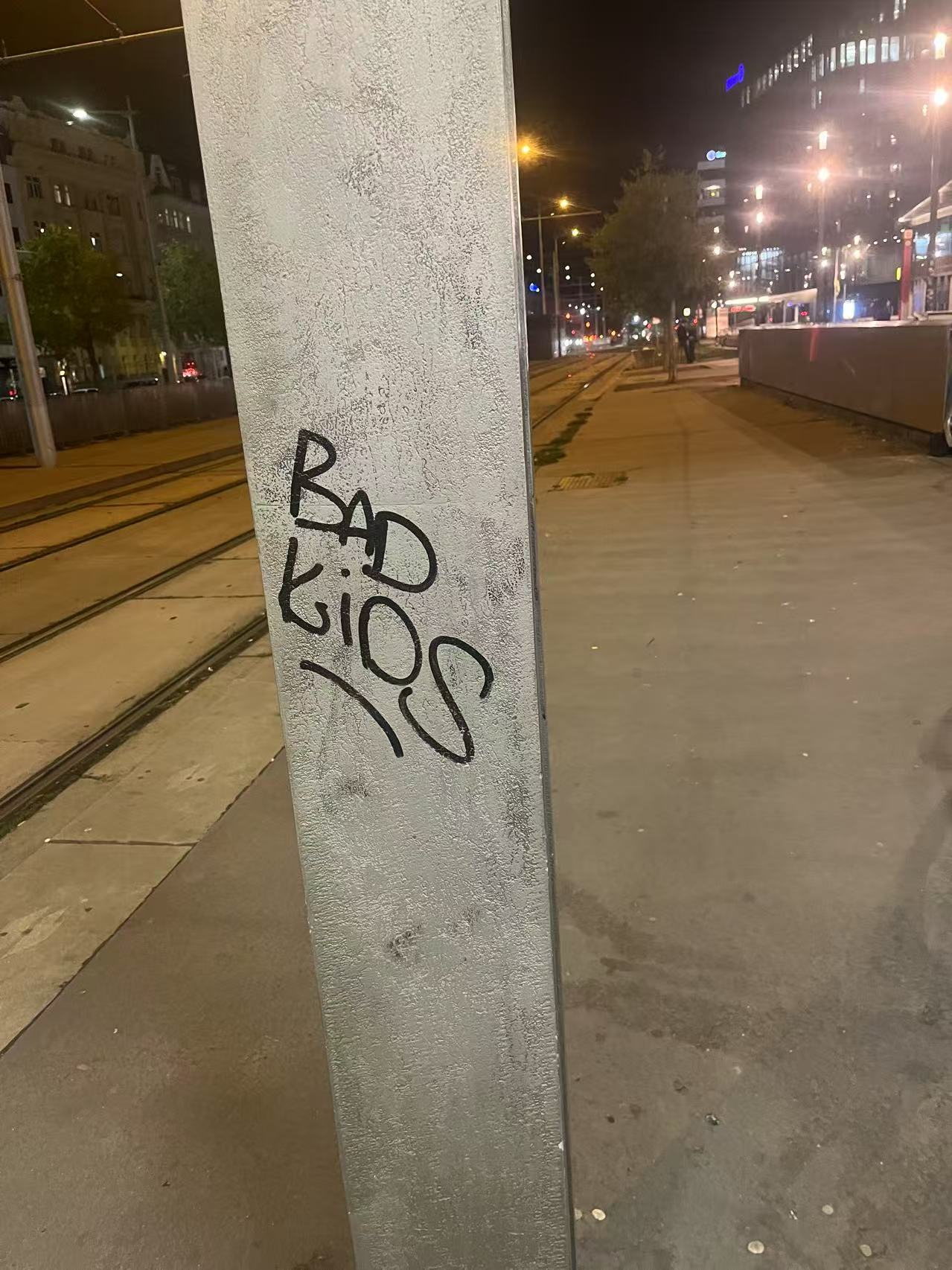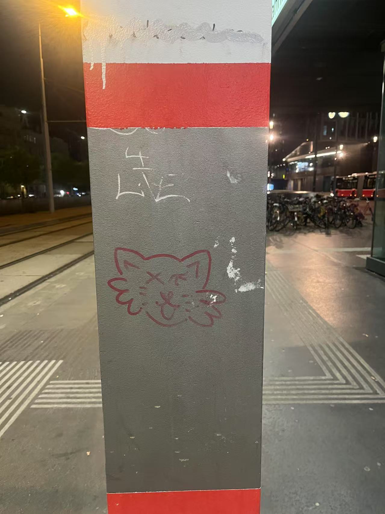 在维也纳短期旅游搭乘公共交通,买72小时票或者周票最划算,也可买单程票。我就待两三天,选了72h票。坐电车去吃饭,轨道边的柱子上的猫猫头和bad kid涂鸦比较有趣。