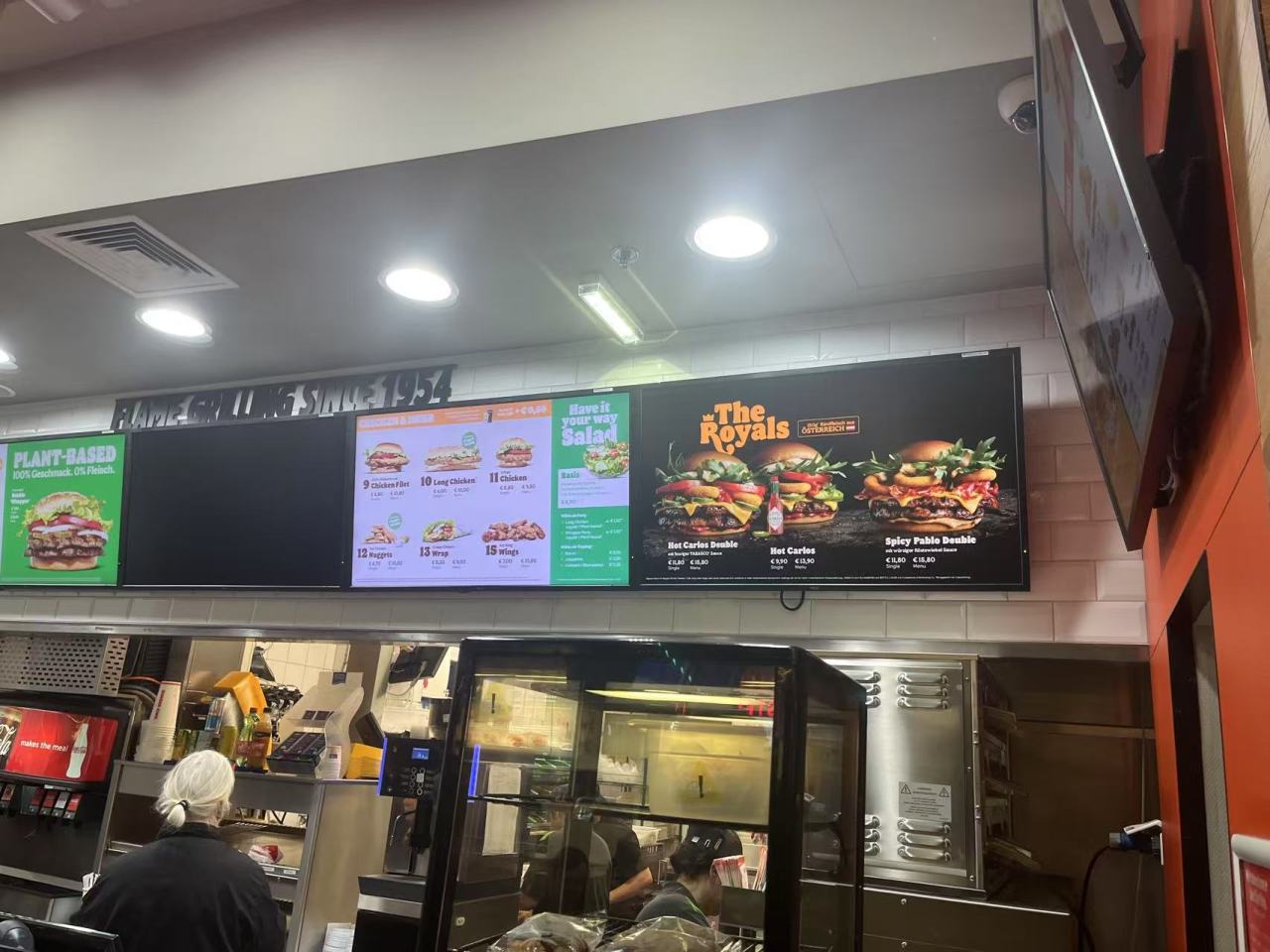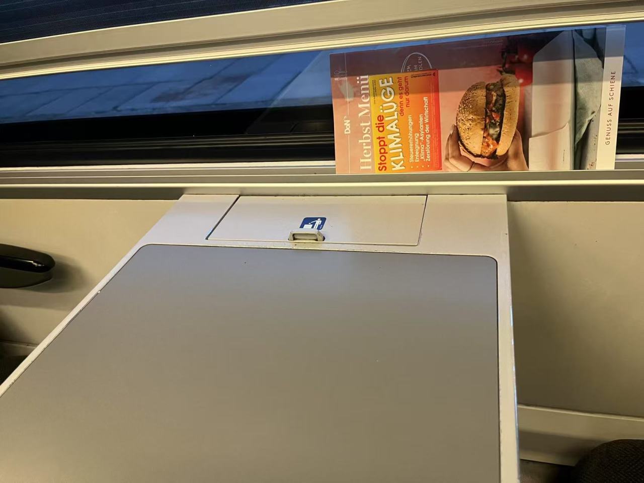 窗侧的小册子上画着一个经典的德式汉堡,上下层的面包看起来干巴巴的(后来我才知道那是黑麦或全麦面包),中间的肉馅也比较杂,不是纯的鸡排或者牛肉。