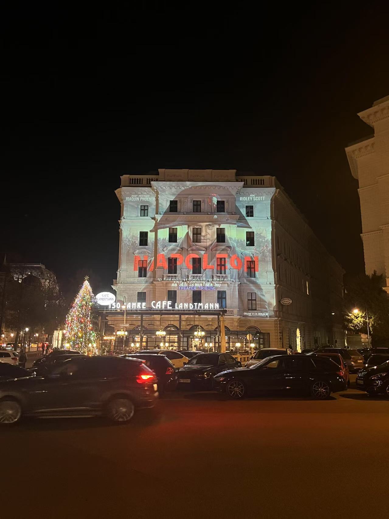 停留稍许,我继续向前走。看到另一家剧院(电影院)外墙壁上的巨型彩色《拿破仑》电影宣传海报时,我不禁哑然失笑。欢快而爽朗的笑声回荡在维也纳的街道上空。