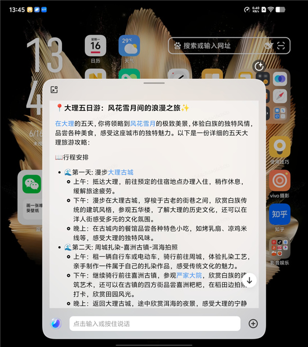以vivo的蓝心小V为例,问答功能基本不在话下,没事唠唠嗑、做做旅游攻略,比如,问它去大理度假该怎么安排,小V的网速也贼拉快,能够直接实时搜索到相关信息并总结出来。