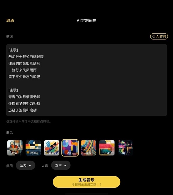 根据照片自动生成影片倒是不难,但时光剪影可以根据照片生成背景音乐,包括词和曲都是AI生成的,这就有点意思了。