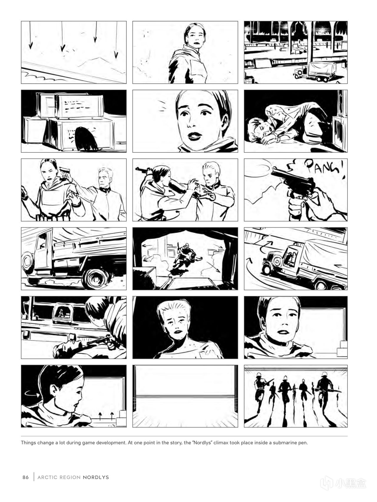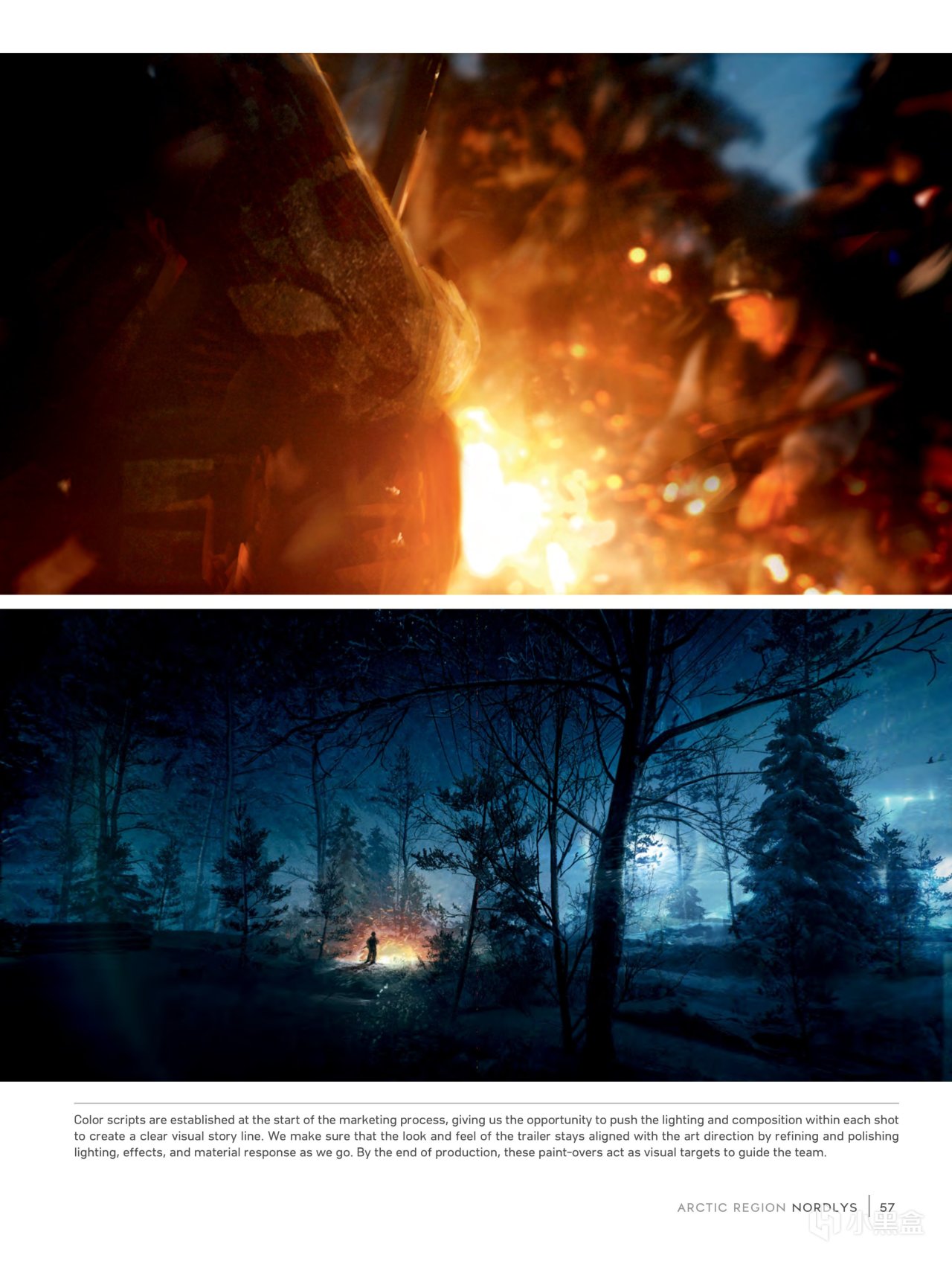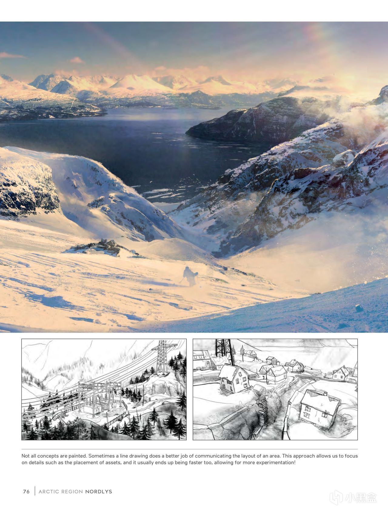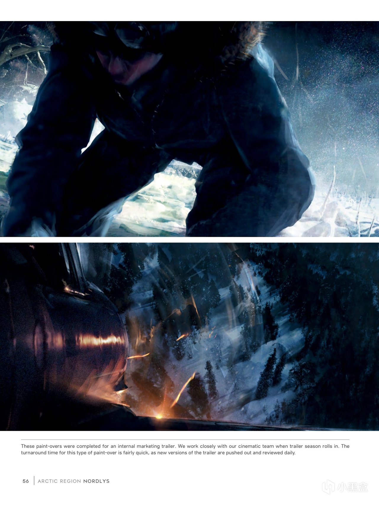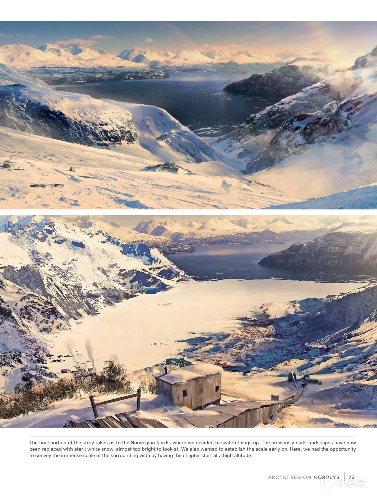 故事的最后部分我们来到了挪威的峡湾,在这里我们决定改变一下。之前阴暗的景观现在被刺眼的白雪取代,几乎亮得让人无法直视。我们还希望尽早确立规模。在这里,我们有机会让章节从高海拔开始,传达周围景观的巨大规模。