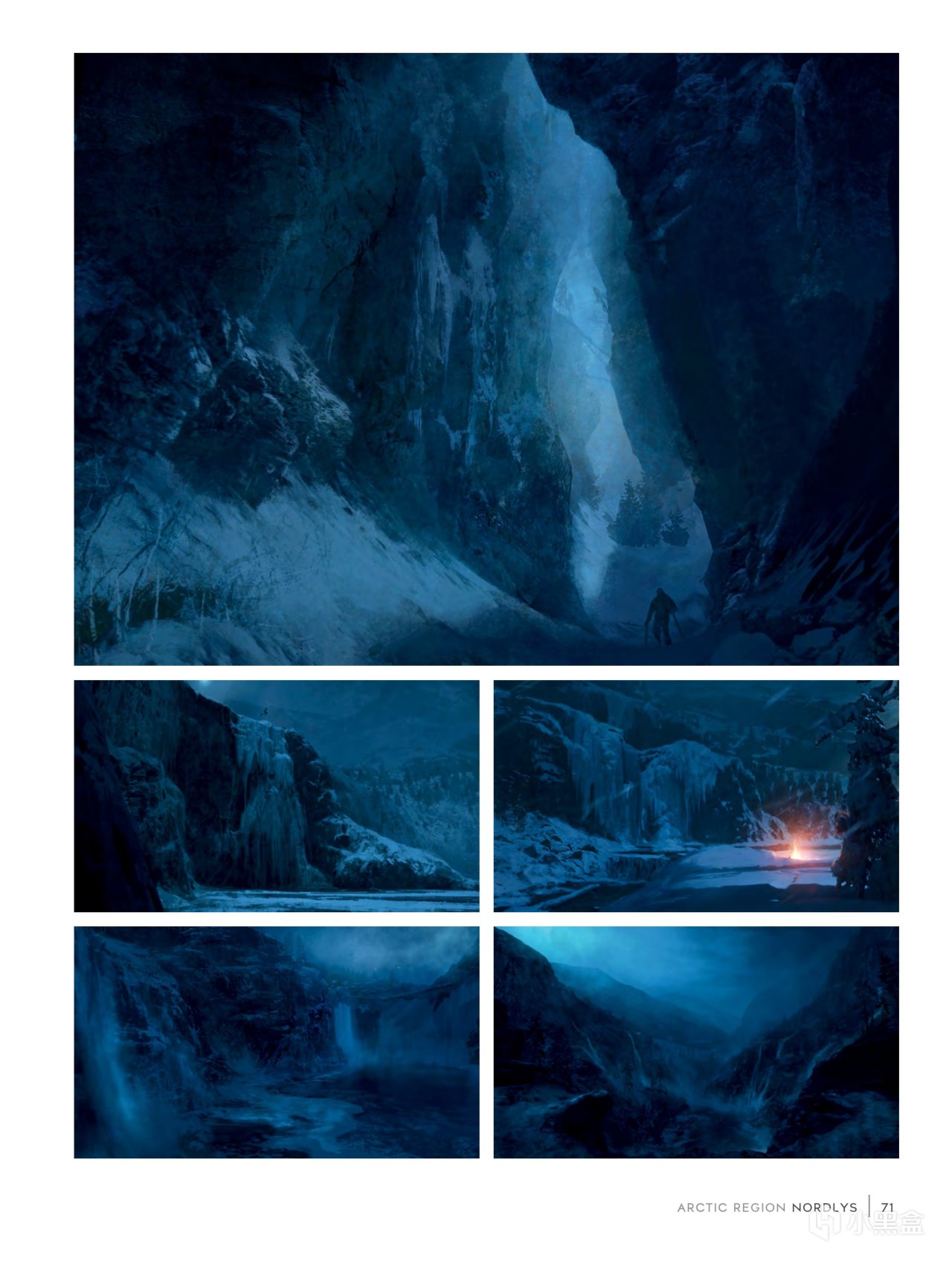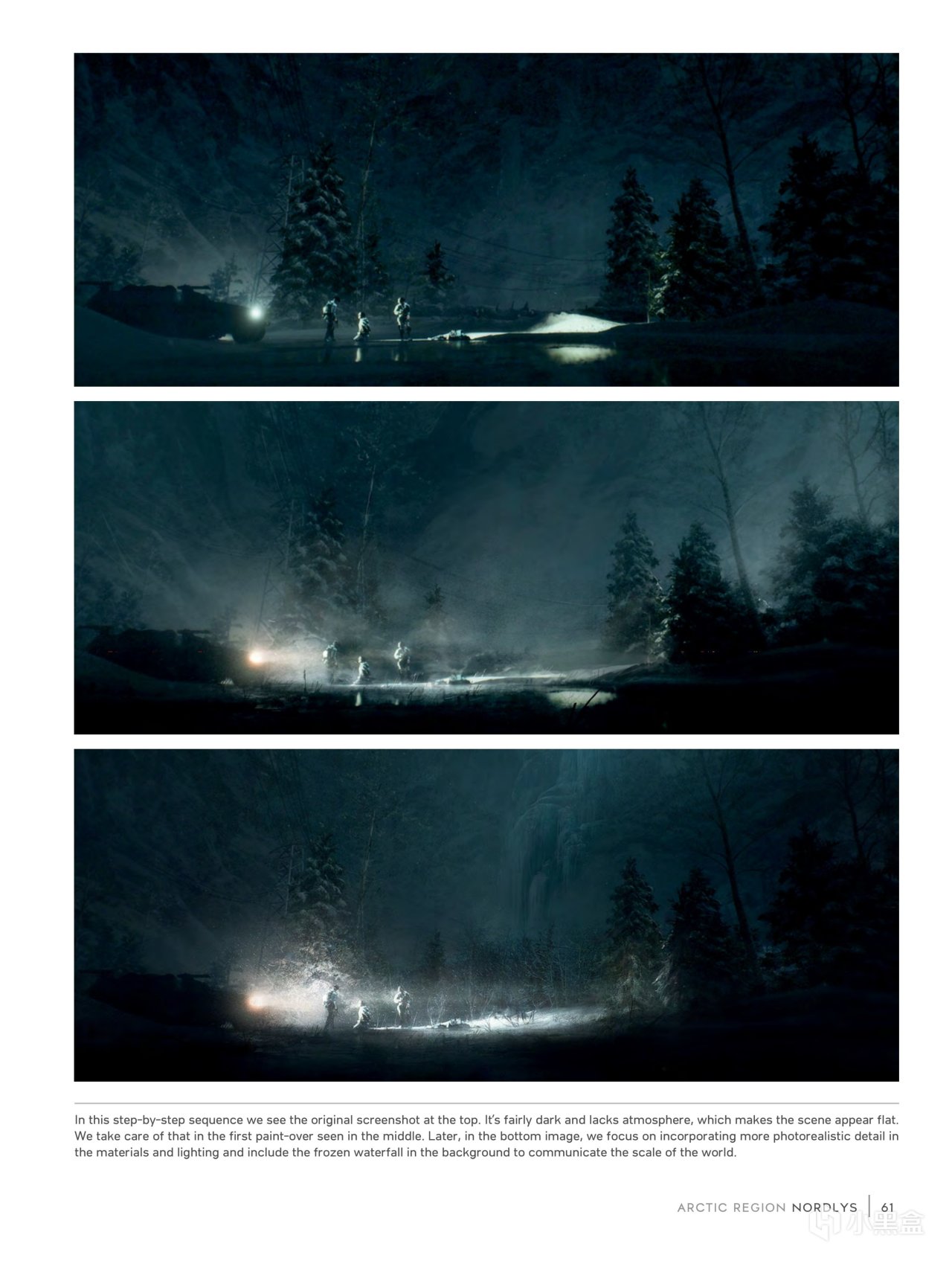 在这个过程中,我们看到顶部的原始截图,画面相当黑暗,缺乏氛围,这使得场景显得平淡。在中间部分的第一次涂鸦中,我们对此进行了处理。在底部的图片中,我们专注于融入更多的细节,包括材料和照明,并在背景中加入了冰冻的瀑布,以传达这个世界的氛围。
