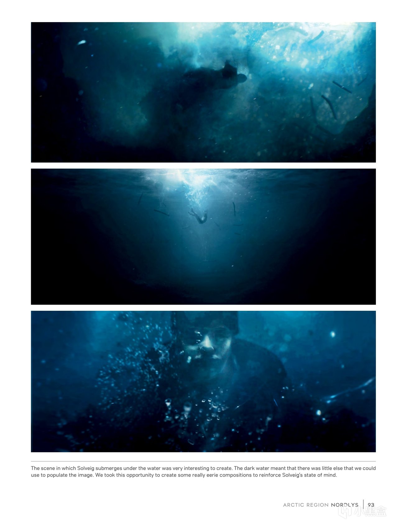 索尔维格潜入水中的场景非常有趣。黑暗的水底意味着我们几乎无法使用其他元素来丰富画面。我们借此机会创造了一些非常诡异的构图,以加强索尔维格的心境。