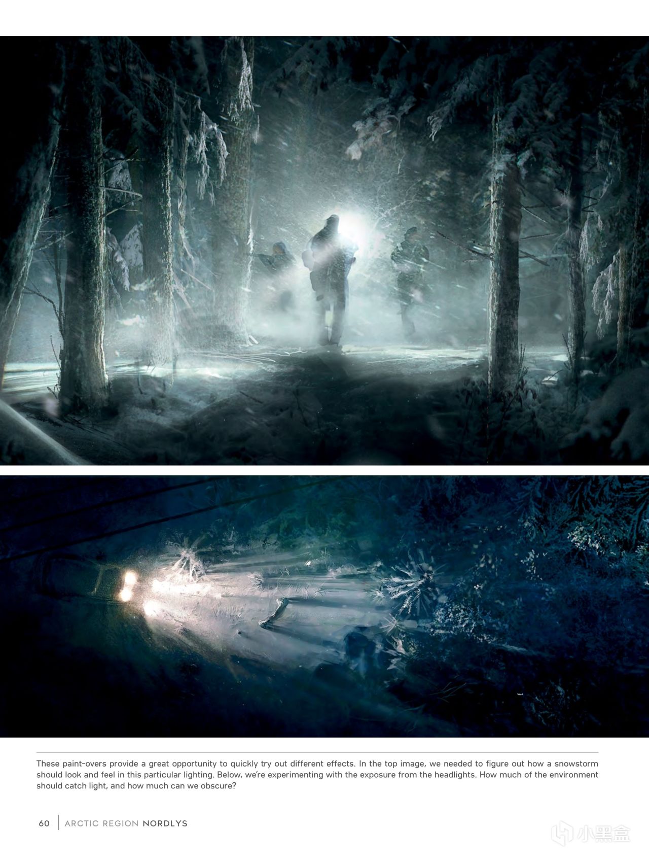 这些涂鸦提供了一个快速尝试不同效果的绝佳机会。在顶部的图片中,我们需要弄清楚在这个特定灯光下雪暴应该是什么样的,以及感觉如何。而在下图,我们在实验灯光的曝光度,环境中应该有多少能够捕捉到光,多少可以被遮挡?