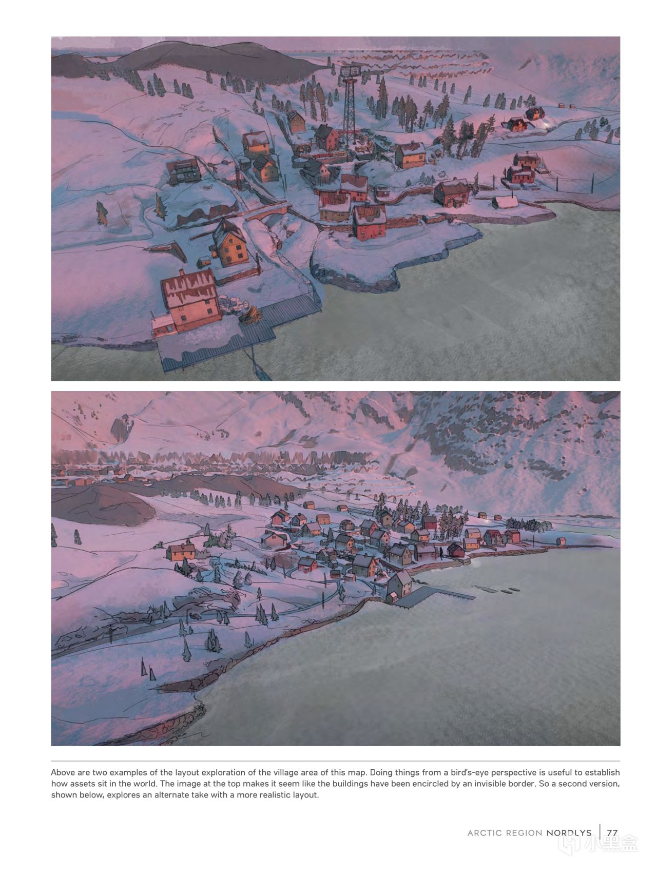 以上是该地图村庄区域布局探索的两个示例。从鸟瞰的角度进行观察有助于确定建筑在世界中的位置。顶部图像使建筑物看起来被一个无形的边界围住。因此,下面展示的第二个版本探索了一个更现实的布局的替代版本。