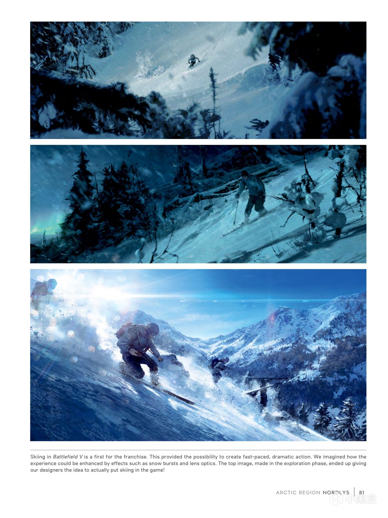 在《战地5》中滑雪是这个系列的首次尝试。这提供了创造快速戏剧性动作的可能性。我们想象了如何通过雪花爆发和镜头光学等效果来增强体验。上面的图像是在探索阶段制作的,最终给我们的设计师提供了将滑雪纳入游戏的想法!