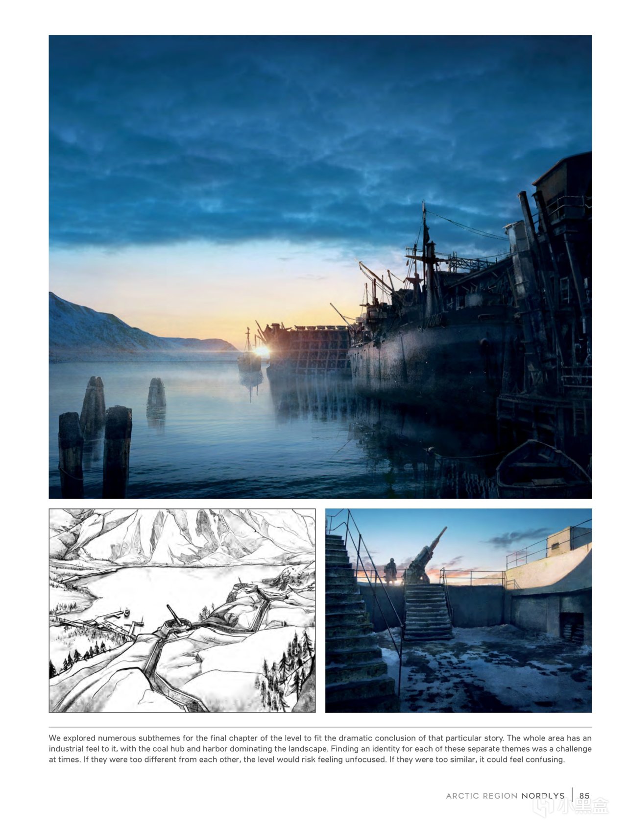我们为这一关卡的最终章节探索了许多子主题,以契合这个特定故事的戏剧性结局。整个区域给人一种工业化的感觉,煤港和港口主导着这一景观。创造这些独立的主题有时是一项挑战,因为如果它们彼此之间差异太大,这一关卡可能会显得不够集中,但如果它们过于相似,则可能会让人感到困惑。