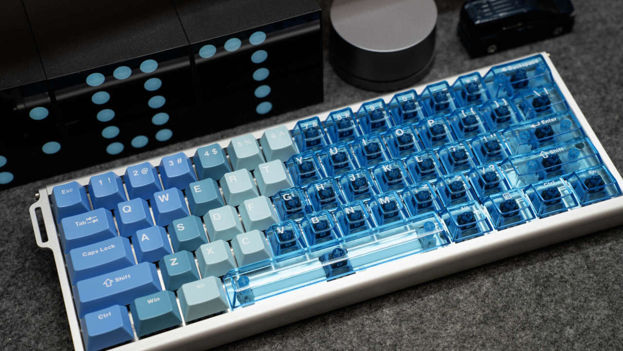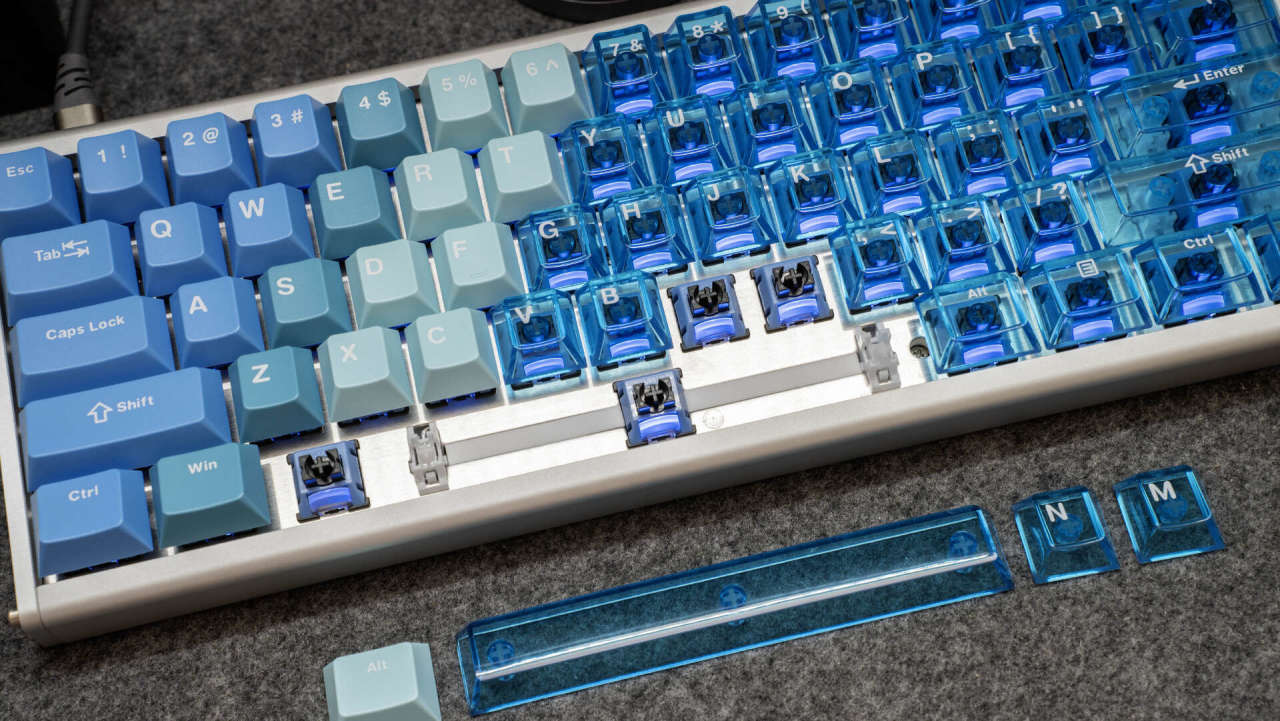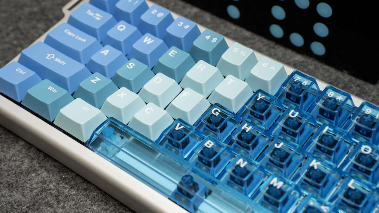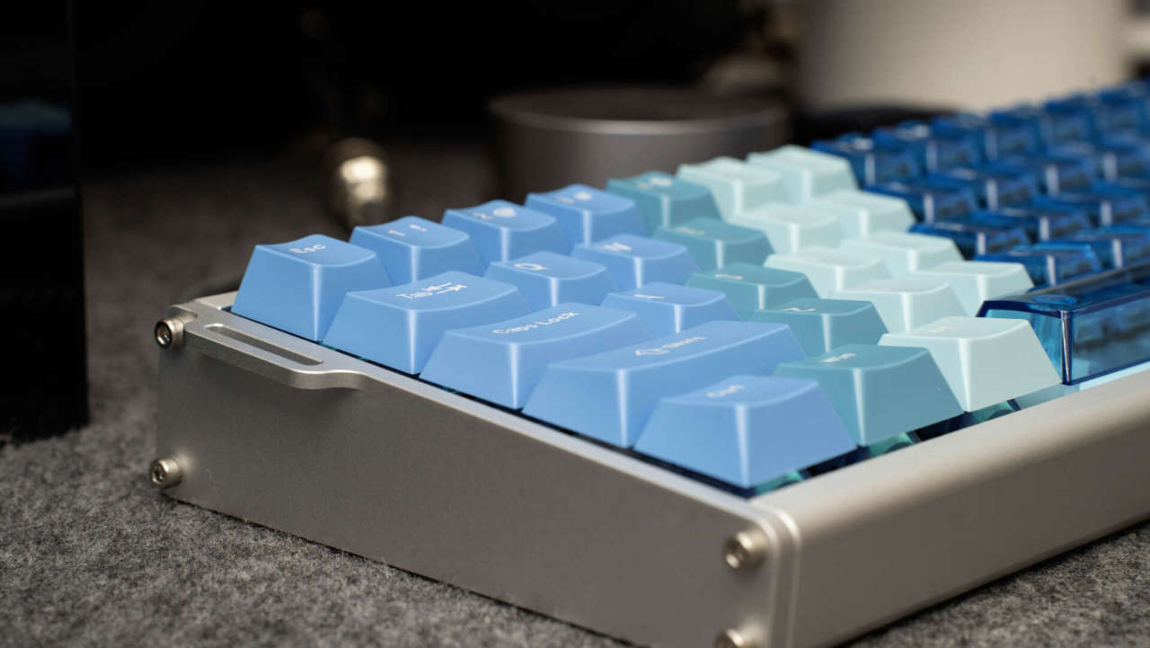 键盘外观颜值出众,它采用6063铝材,经180目喷砂与阳极氧化工艺处理,触感细腻,不易留有指纹。键盘主体颜色由莫兰蒂蓝向透明蓝色的键帽渐变,时尚精致,冰川蓝的配色也是深得我心。