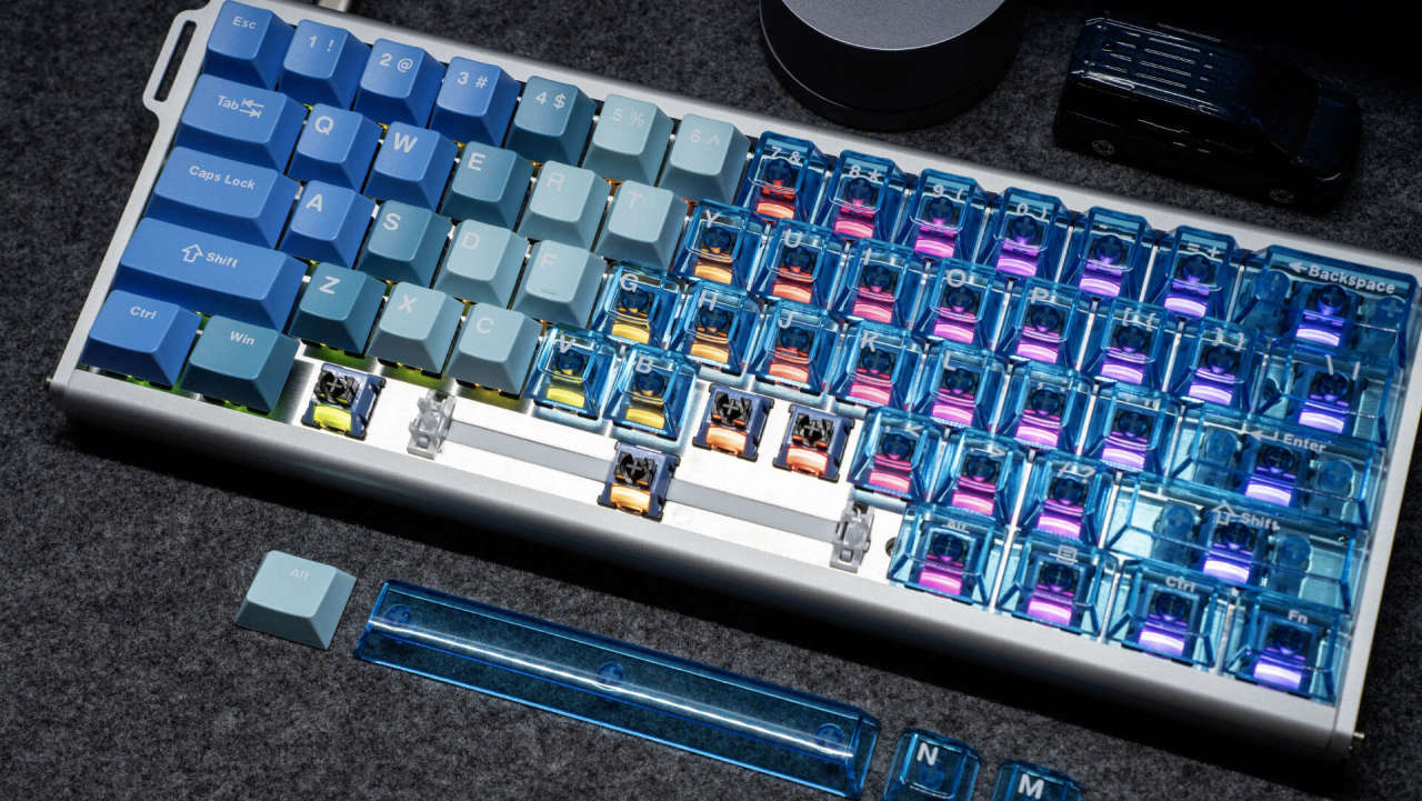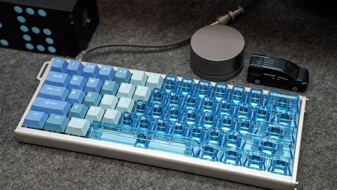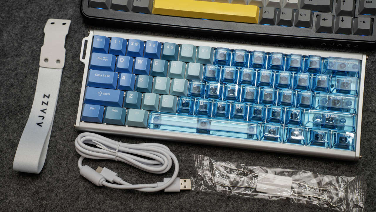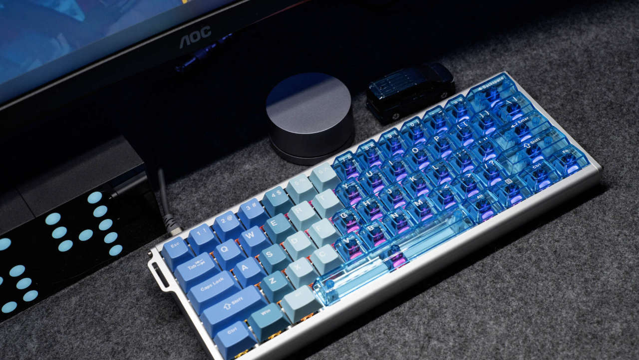 键盘外观颜值出众,它采用6063铝材,经180目喷砂与阳极氧化工艺处理,触感细腻,不易留有指纹。键盘主体颜色由莫兰蒂蓝向透明蓝色的键帽渐变,时尚精致,冰川蓝的配色也是深得我心。