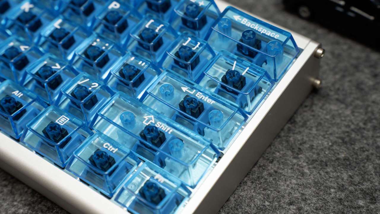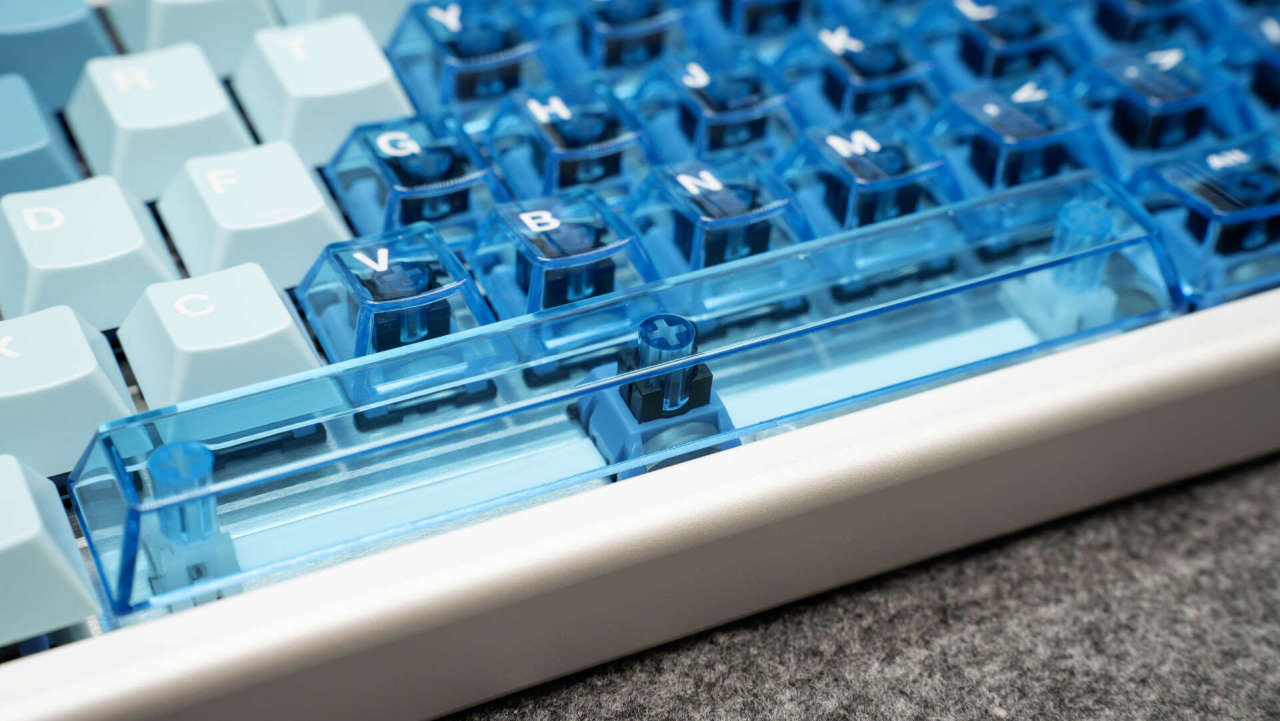 它的键帽是PBT+PC双拼材质,左侧为磨砂PBT键帽,右侧为透明PC键帽,透光性极佳,蓝色的键帽上的字符也比较清晰,手感也很细腻。