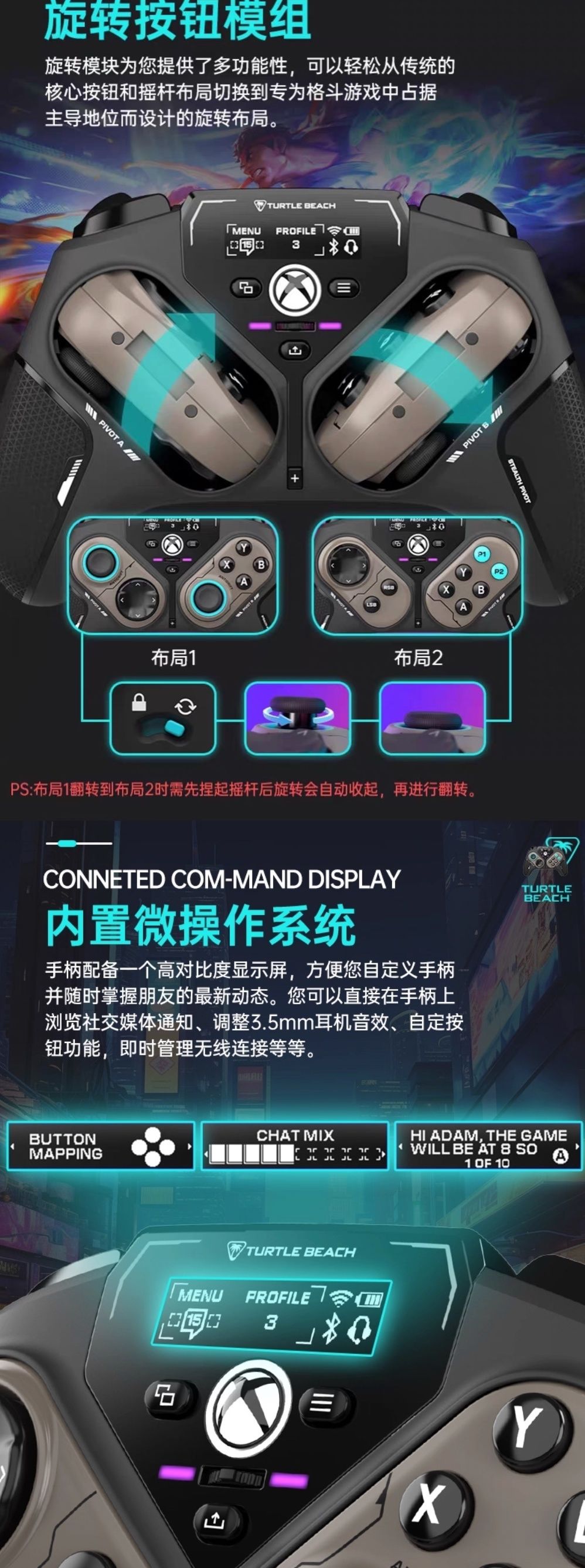 該手柄提供一塊顯示屏,支持自定義內容,手柄提供“旋轉模組”,可通過旋轉切換不同的鍵位。手柄按鈕支持自定義映射,同時手柄配備了 2 個背鍵。