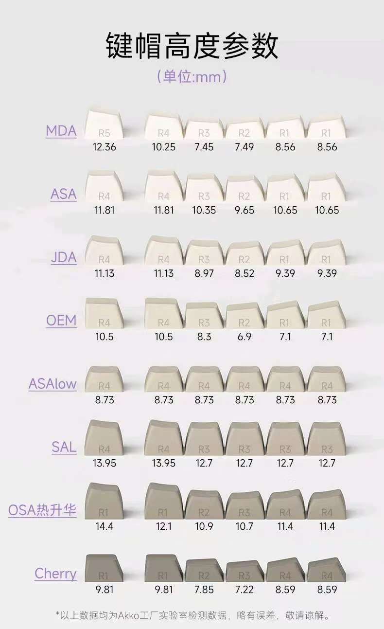 键盘键帽的高度既影响着一款键盘的美观程度,也影响着它的手感。目前市面上较为常见的键帽高度有SA、OEM、Cherry原厂高度、XDA/DSA、MDA五种。