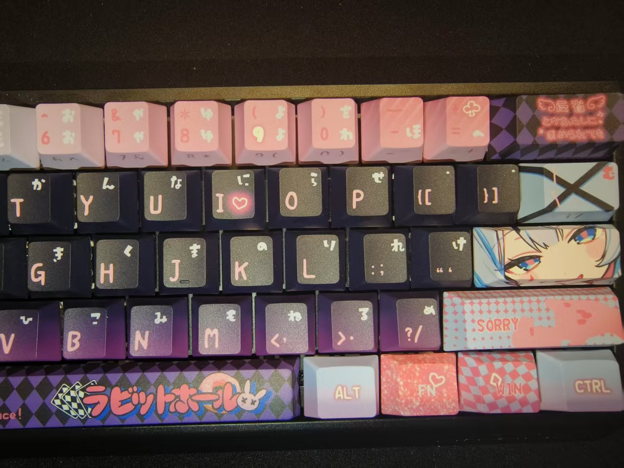 至于不透光以及半透光键帽,说法可就多了。你首先要知道自己是喜欢简约风还是花哨风,简约风的特点是虽然许多键帽都有比较有特色的图案,但整体看上去较为简洁,给人一种朴素但不失文雅的感觉,这个可以参考NCS家的键帽,花哨风大多数则以整体图案连贯为主,比如这样一整个二次元人物图案都刻到键帽上面,比如泰坦国度的兔子洞。这两种睫毛各有各的优势,因人而异,自行选择购买即可。