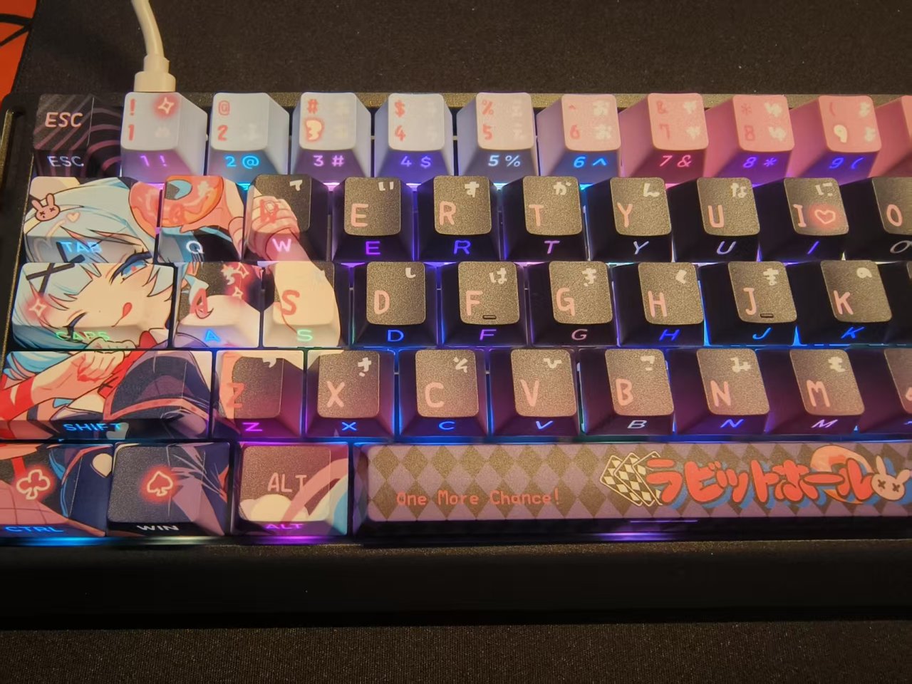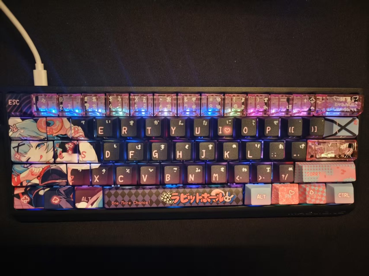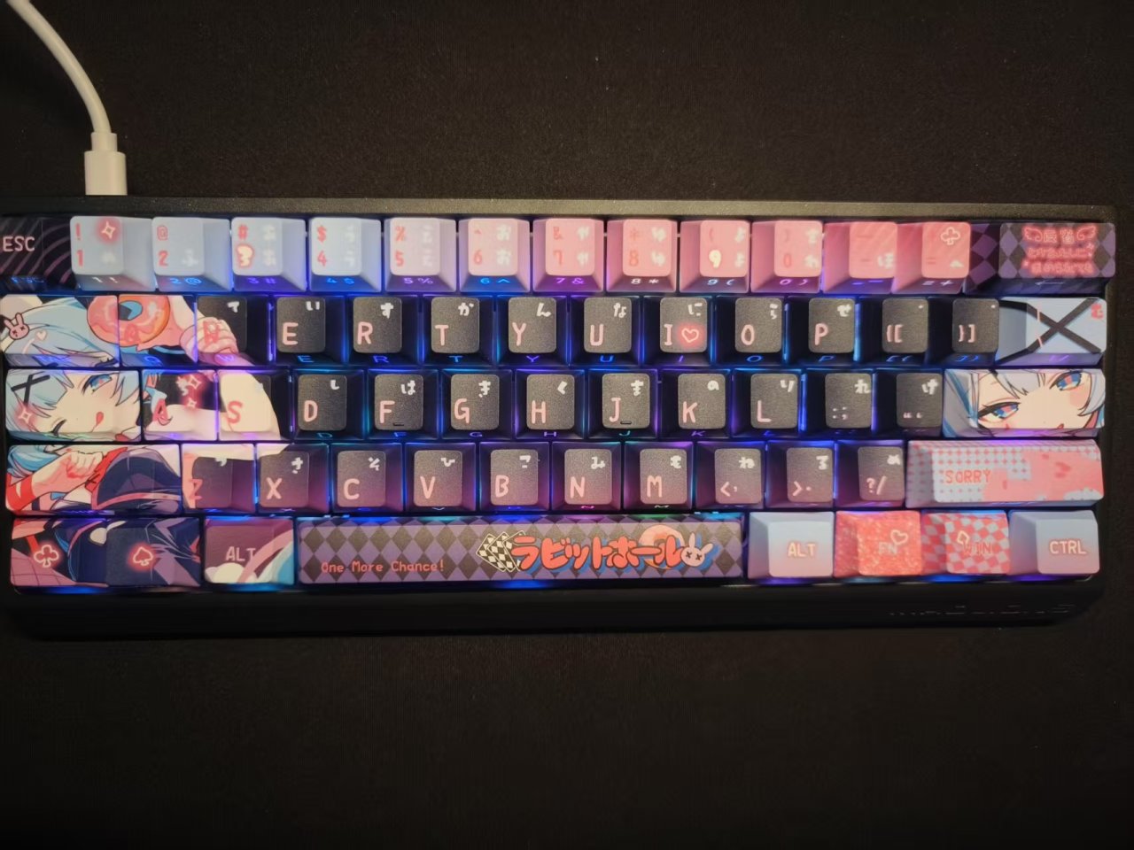 不过要论最能完美解决这个问题的,还得佩服泰坦国度的兔子洞键帽,这款键帽同时考虑到了灯光以及颜值,虽然这款键帽的顶部并不透光,但是做了侧刻透光处理,也就是说它同时有侧刻字母和正刻字母两种形式,这也满足了不同玩家对于各种角度观看字母的需求,而且还有配套的PC键帽,虽说是36键款,但是玩家们完全可以根据自己的喜好自行选择点缀,再搭配上极具魅惑性的洞洞兔初音未来形象,颜值上也是相当的高。