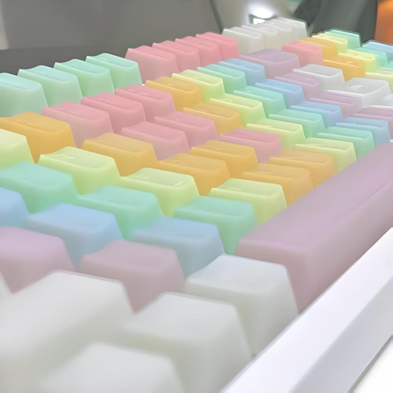 PC材质学名聚碳酸酯,这种材质虽说并不是键帽的主流材质,但基本上在打造客制化键盘的时候总会点缀上那么几颗。PC材质具有高透明度、高韧性和良好的透光性,因此能够完美展示 RGB灯光效果 ,营造炫酷氛围,其缺点也很明显,如容易粘指纹、易被刮花和氧化发黄,因此并不适合整个客制化键盘全部使用PC材质,当然,解决办法是有的,比如薄荷糖家家的黑透键帽就在原有材质的基础上做了磨砂雾化处理,使其同时兼具了高颜值和抗氧化能力。