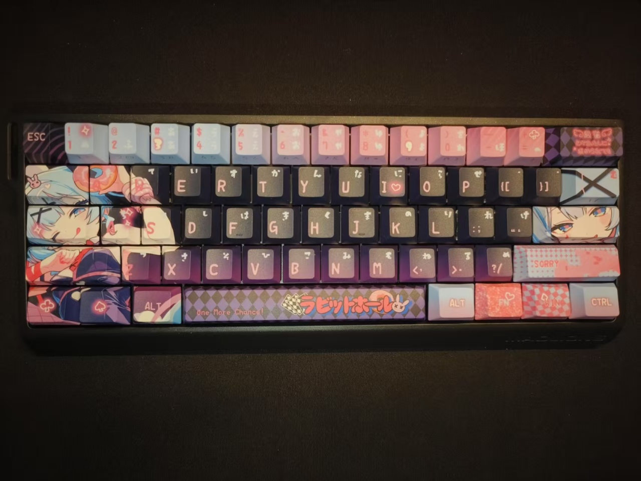 PBT材质算是目前市面上键盘以及键帽采用最多的一种材质。这种材质相较于未经工艺的ABS材质,成本更高,工艺也更为复杂。其耐磨程度更是远高于ABS材质键帽,基本上不会出现打油现象。并且耐高温耐腐蚀,不过手感要略逊于ABS材质,因此这种材质更适合新手小白去尝试。笔者此前推荐过的薄荷糖M客制化的Eva系列键帽和NCS键萌的今汐、赛博朋克键帽都是PBT材质,不过这些键帽走的都是简约风,如果你更喜欢花里胡哨的,那么可以考虑一下泰坦国度的兔子洞键帽,这点后面笔者还会详细去讲解。