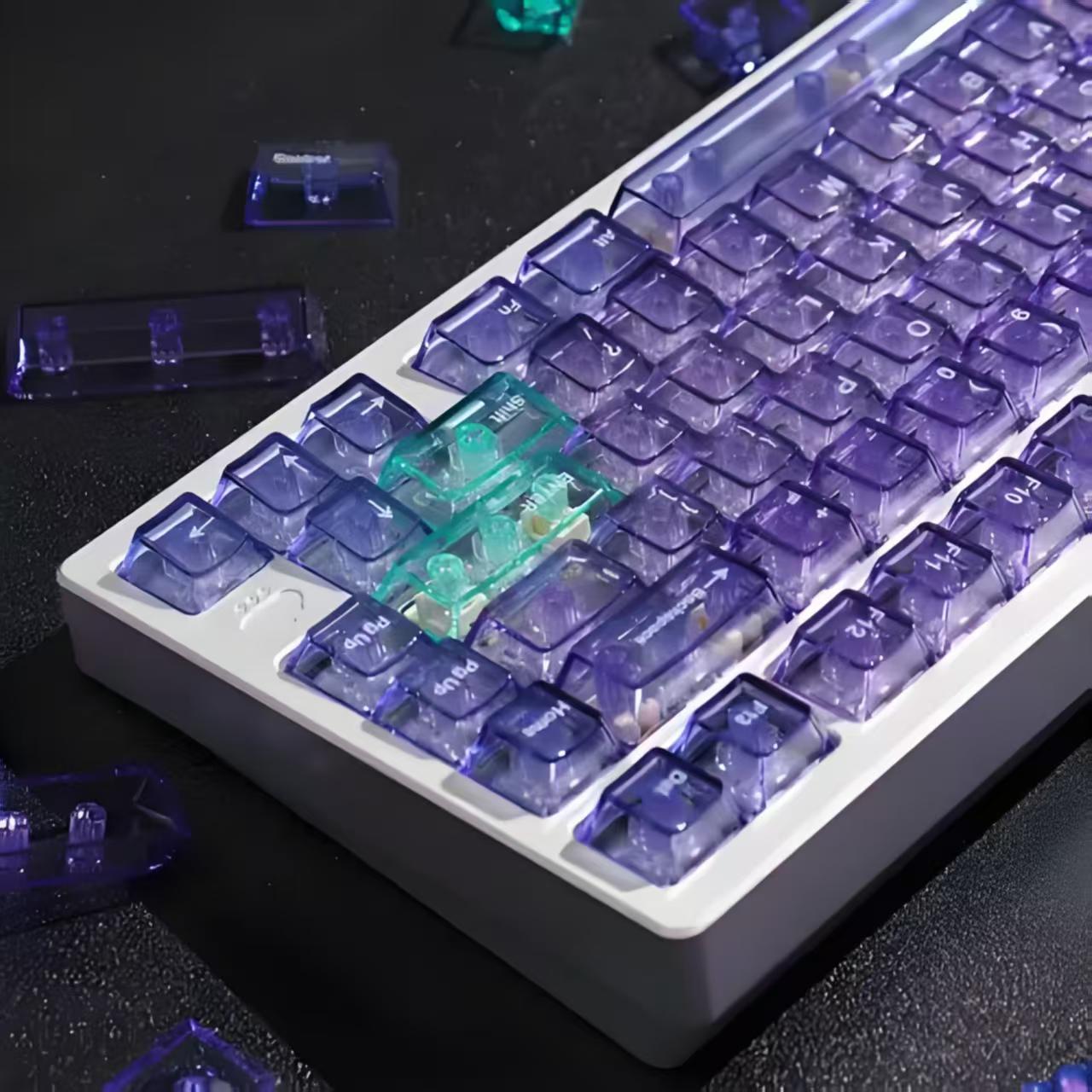 透光讲究的就是光污染,如果你是一位光污染玩家,那么不要犹豫,直接入手透光键帽就完事了,到了晚上那颜值绝对能惊艳到你。全透和雾透最大的区别就是没有做雾化处理,一般全透键帽使用的是PC材质,因此能够一览无余的看到轴体的结构,如果你的轴体颜值较为美观的话,那么可以考虑入手全透键帽,但是全透键帽的最大的问题是表面过于光滑,因此非常不耐脏,尤其是在夏天长时间使用的话,会非常影响的键盘的颜值,大多数情况全透键帽更适合搭配不透光键帽点缀使用。