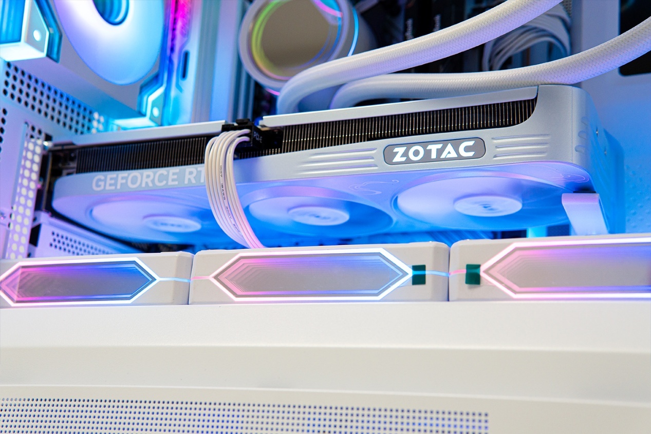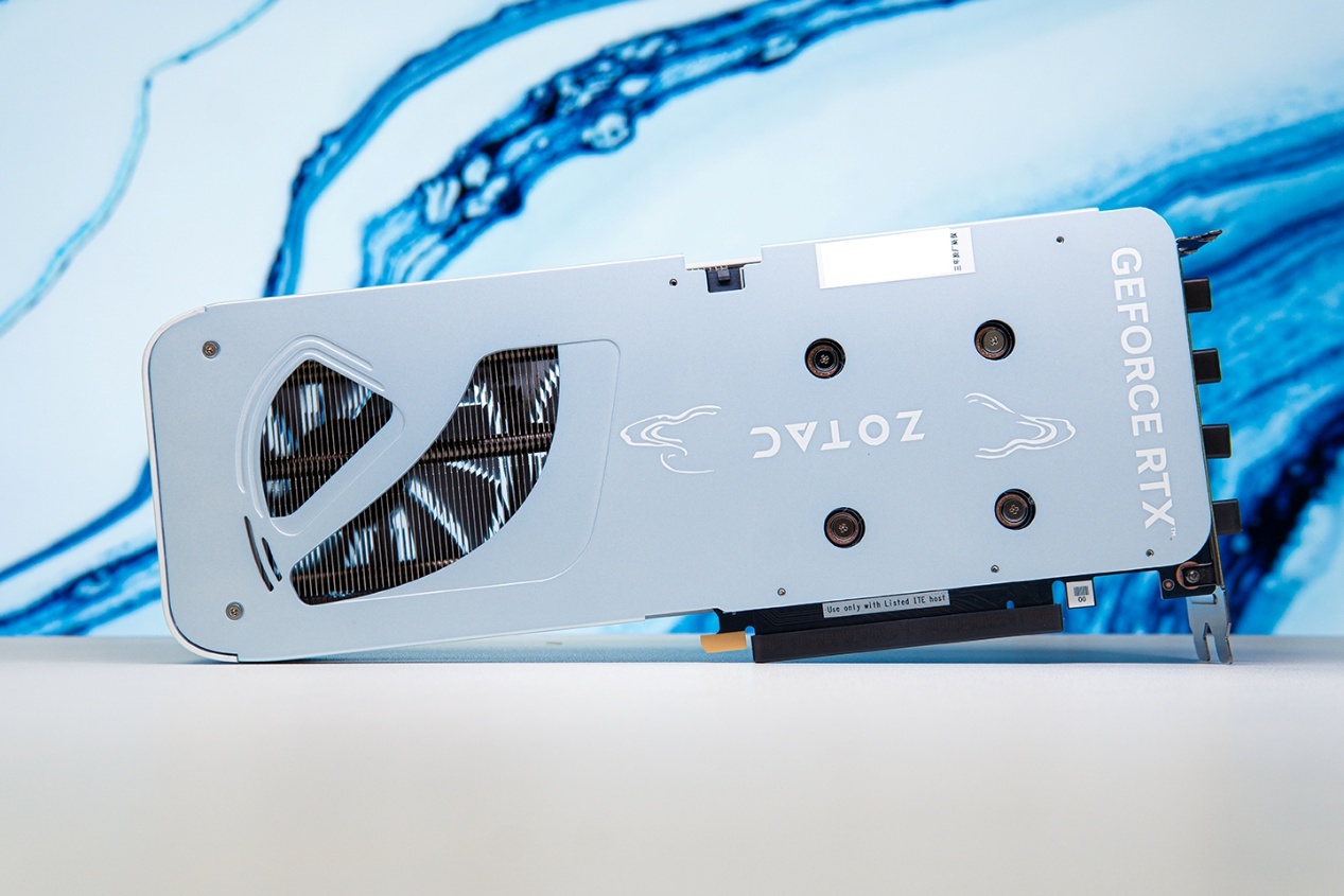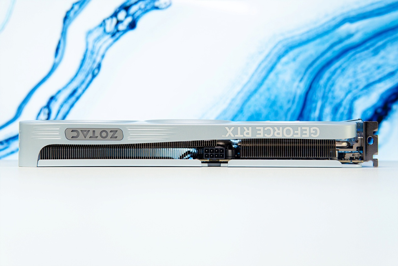 侧面可以看到【ZOTAC】logo,其支持ARGB灯效,可任意调整颜色。接口则是单8Pin,可搭配的电源选择就非常丰富了。