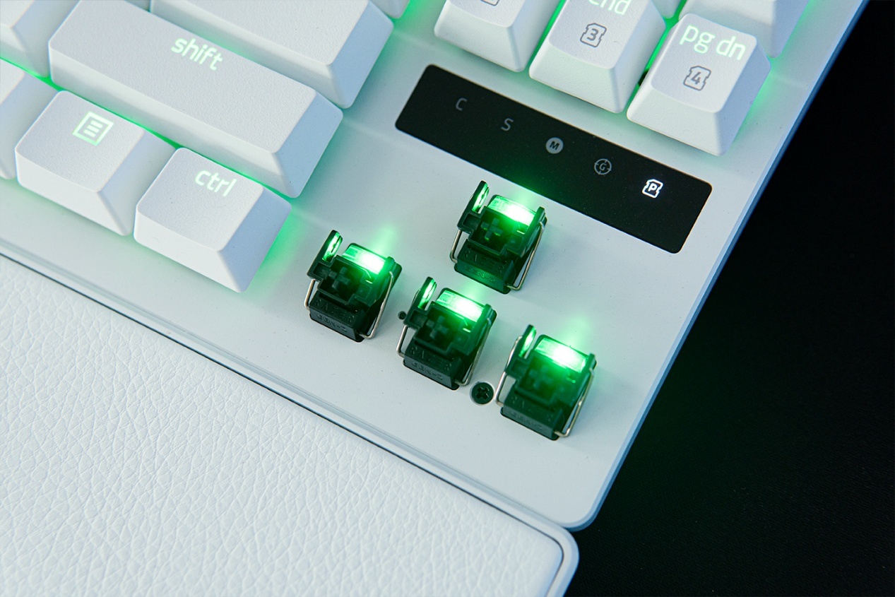 模拟光轴的外型和常见的机械轴或者磁轴有非常大的区别,其功能倒是和磁轴类似,可调节触发范围为0.10-4.0mm,触发压力40g,使用寿命一亿次,支持RT模式,相比磁轴,光轴不会受到环境温度、磁场干扰,稳定性更高,在驱动中可以设置快速触发、多段触发、模拟输入、RT急停等。