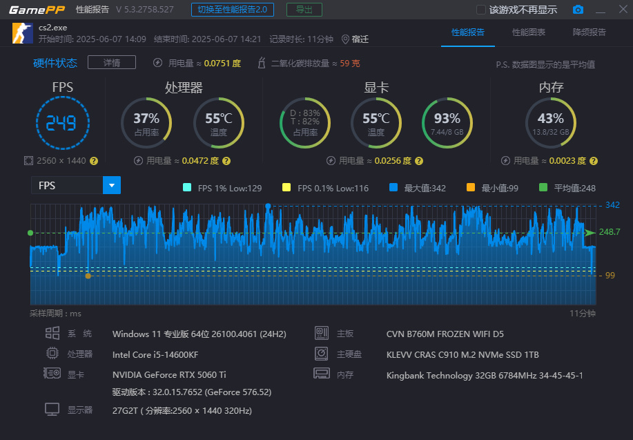 测试下《CS2》的效果,2K分辨率默认画质平均帧率249,1%Low帧129,最高帧率342,游戏过程中有一定波动,实际体验还是比较流畅的,想要帧率更稳定,建议适当降低画质。