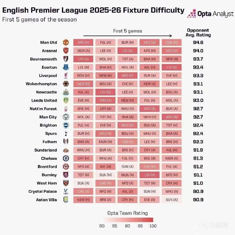 Opta分析英超20队开局前五难度 曼联第一 阿森纳第二