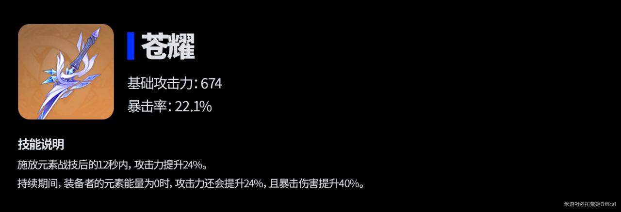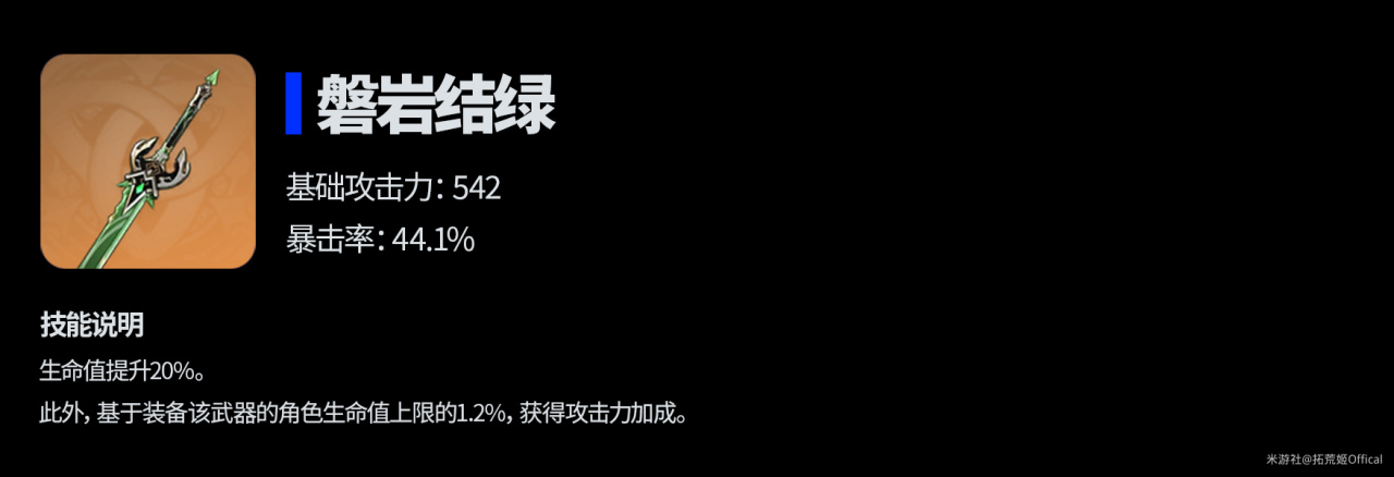 说明:绿剑的泛用性在早期可以说是无可挑剔的,只要队伍中没有过多暴击buff或携带猎人、黑曜这类提供高额暴击率的圣遗物时,基本都可以作为下位替代使用,即使是不堆生命的攻击c,特效也能提供常态240以上的攻击力,队伍中有双水buff时基本在280攻击以上,只要暴击率不溢出都可以作为优先考虑的对象。