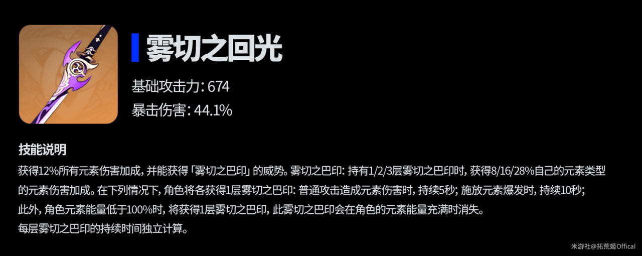 说明:雾切的特效也是提供增伤,数值上来说略低于波乱但覆盖率更好,实战选择时根据自己的武器持有情况和丝柯克本身的双暴配平选择即可。