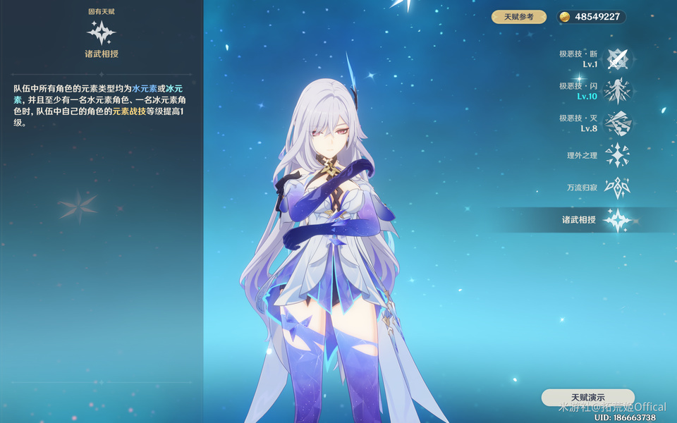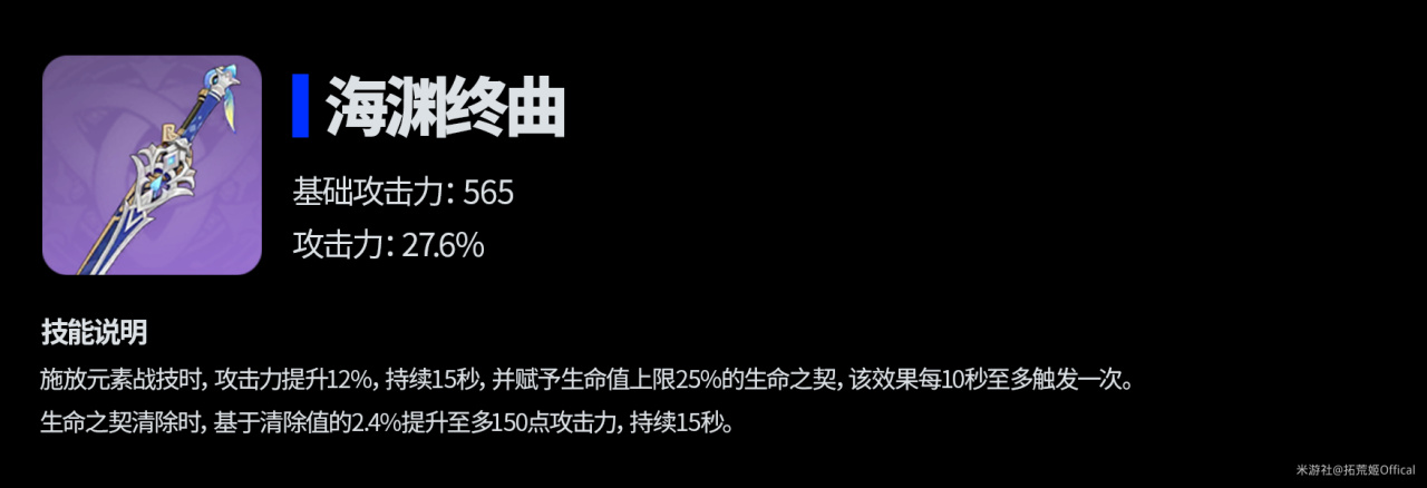 类似公子的诸武精通,可以提高全队元素战技天赋一级,在搭配爱可菲、芙宁娜等主要输出手段为元素战技时效果尚可,但需要队伍自肃水冰才可触发。