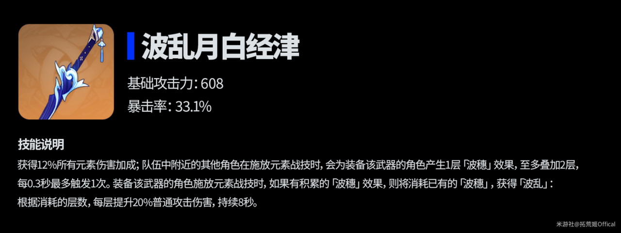说明:在常规的站场普攻输出流派中,丝柯克的所有输出都来自普攻,波乱的特效约等于提供了52% 全增伤,但其中的40%增伤仅持续8s,而丝柯克一轮的普攻输出时间通常为10-12.5s,无法全程覆盖,但仍然是五星武器中的优选。