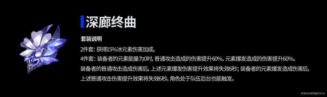 在丝柯克的常规站场普攻或爆发速切两种输出方式中,深廊终曲都能提供对应的75%增伤。但需要注意的是,在上文提过的深渊第一间这种开局满能量的环境中,丝柯克可以大招爆发后接普攻输出,这种情况下只有元素爆发能吃到75%增伤,而普攻只能吃到二件套的15%冰伤,但终究是瑕不掩瑜,深廊终曲还算是丝柯克的毕业最优选。